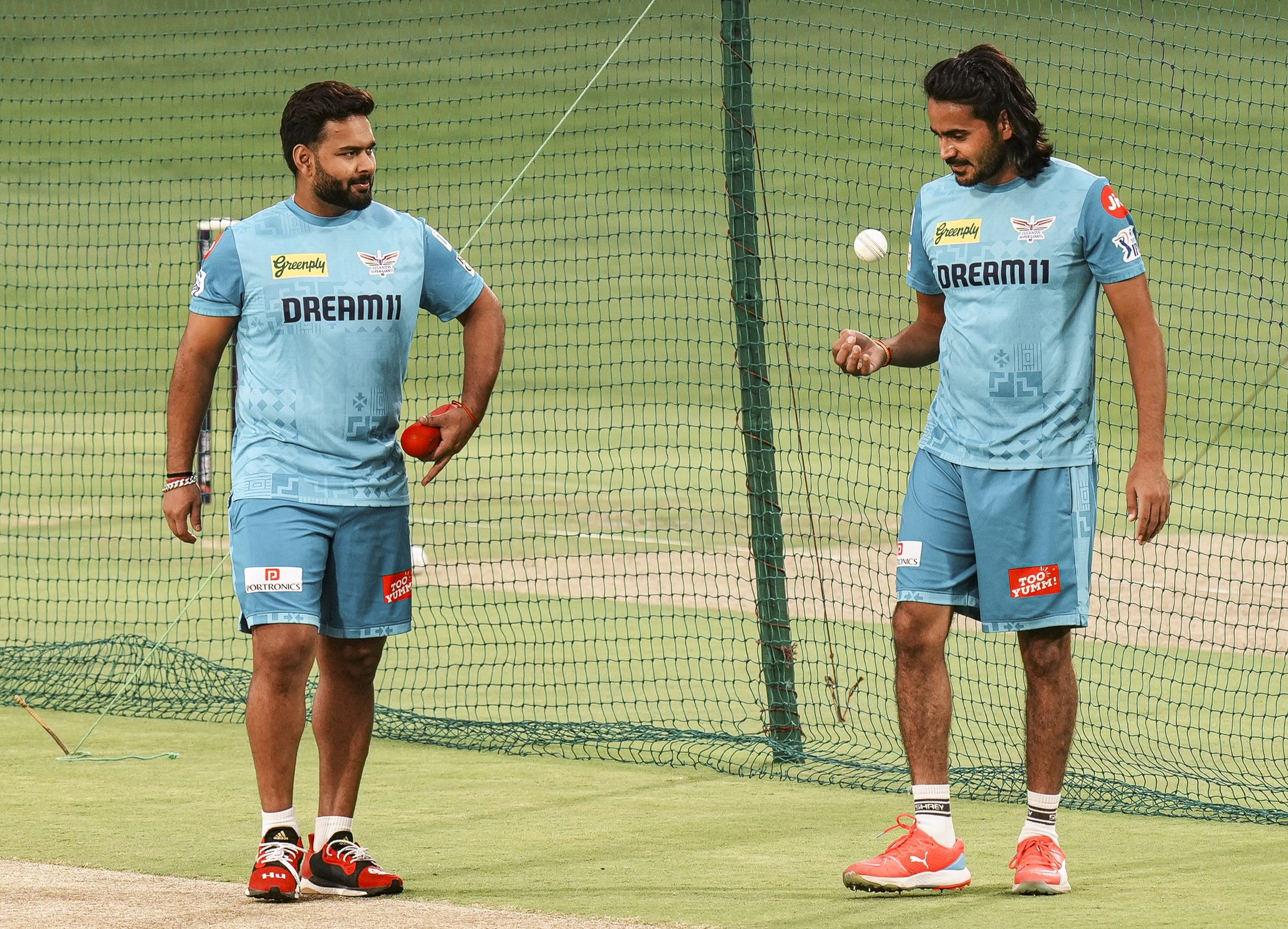 Dharamshala: Lucknow Super Giants' captain Rishabh Pant with teammate Digvesh Rathi during a practice session ahead of the Indian Premier League (IPL) 2025 cricket match between Punjab Kings and Lucknow Super Giants, at Himachal Pradesh Cricket Association stadium in Dharamshala, Saturday, May 3, 2025. (PTI Photo/Manvender Vashist Lav)(PTI05_03_2025_000338B)