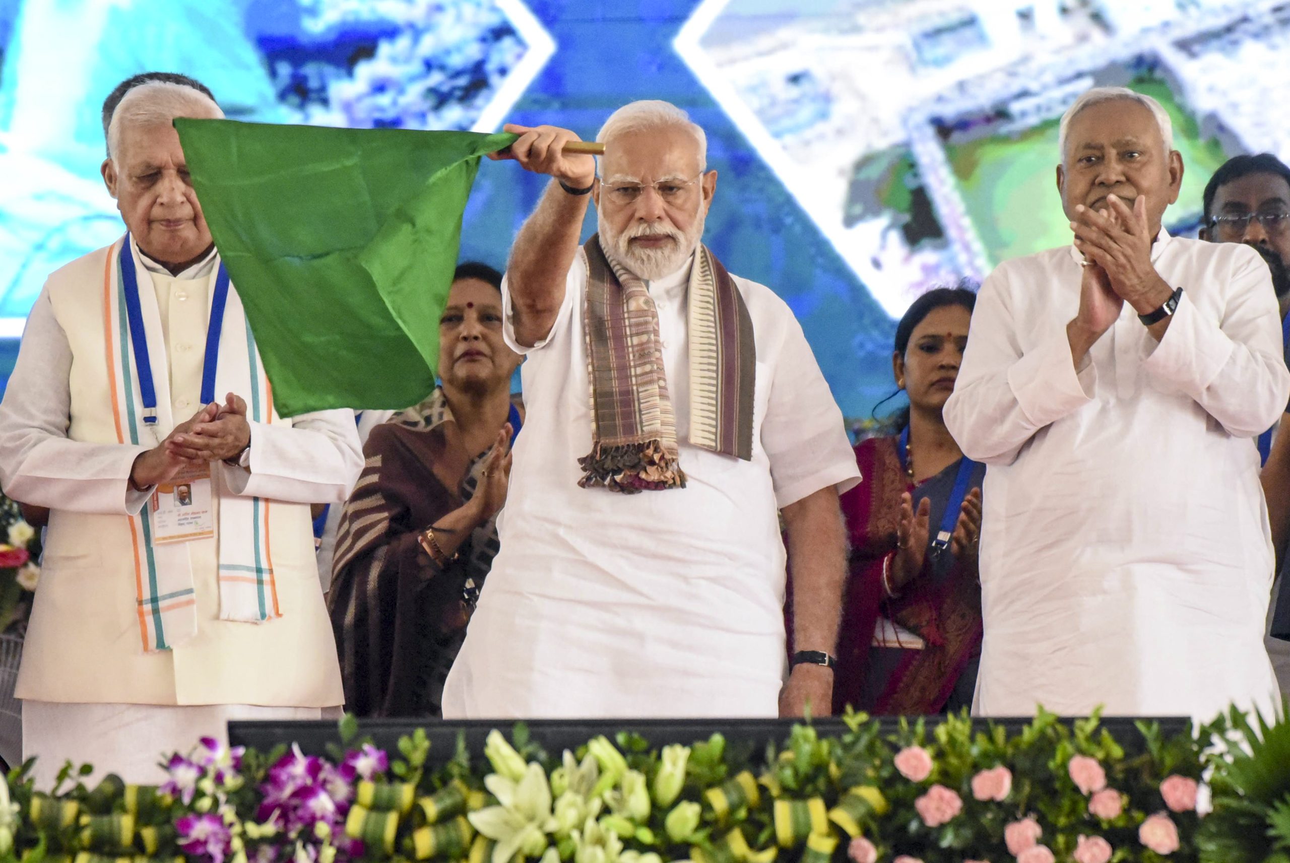 After the inauguration of the Aunta-Simaria Bridge, the PM stood on the bridge and waved at crowds, holding the hand of Chief Minister Nitish Kumar.