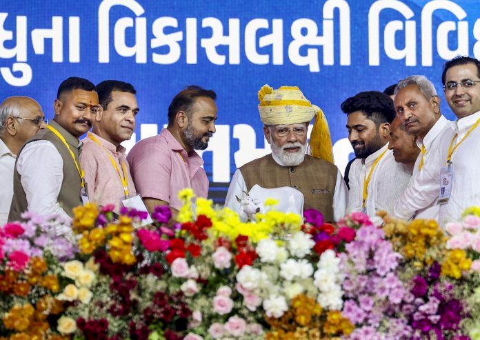 **EDS: THIRD PARTY IMAGE; TO GO WITH STORY** In this image released on March 31, 2026, Prime Minister Narendra Modi is being felicitated during a public meeting at Nani village, in Vav-Tharad district, Gujarat. (PMO via PTI Photo) (PTI03_31_2026_000346B) *** Local Caption ***