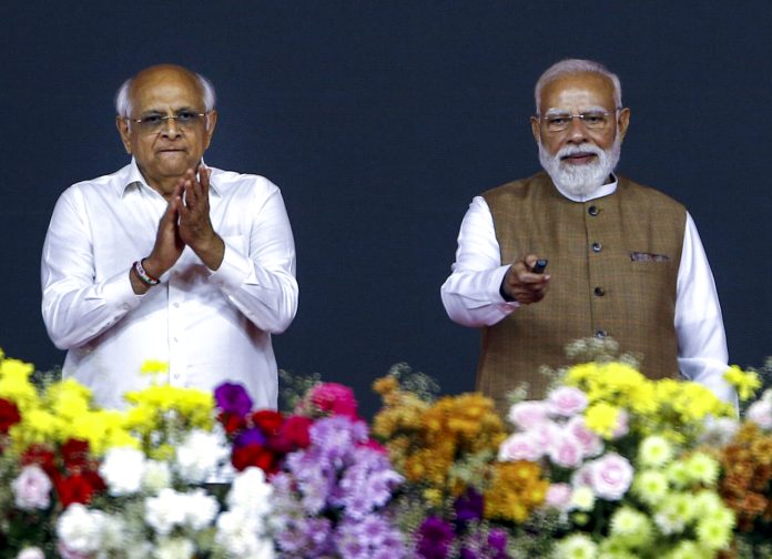 Vav-Tharad: Prime Minister Narendra Modi, right, and Gujarat Chief Minister Bhupendra Patel during a public meeting at Nani village, in Vav-Tharad district, Tuesday, March 31, 2026. (PTI Photo) (PTI03_31_2026_000338B) *** Local Caption ***