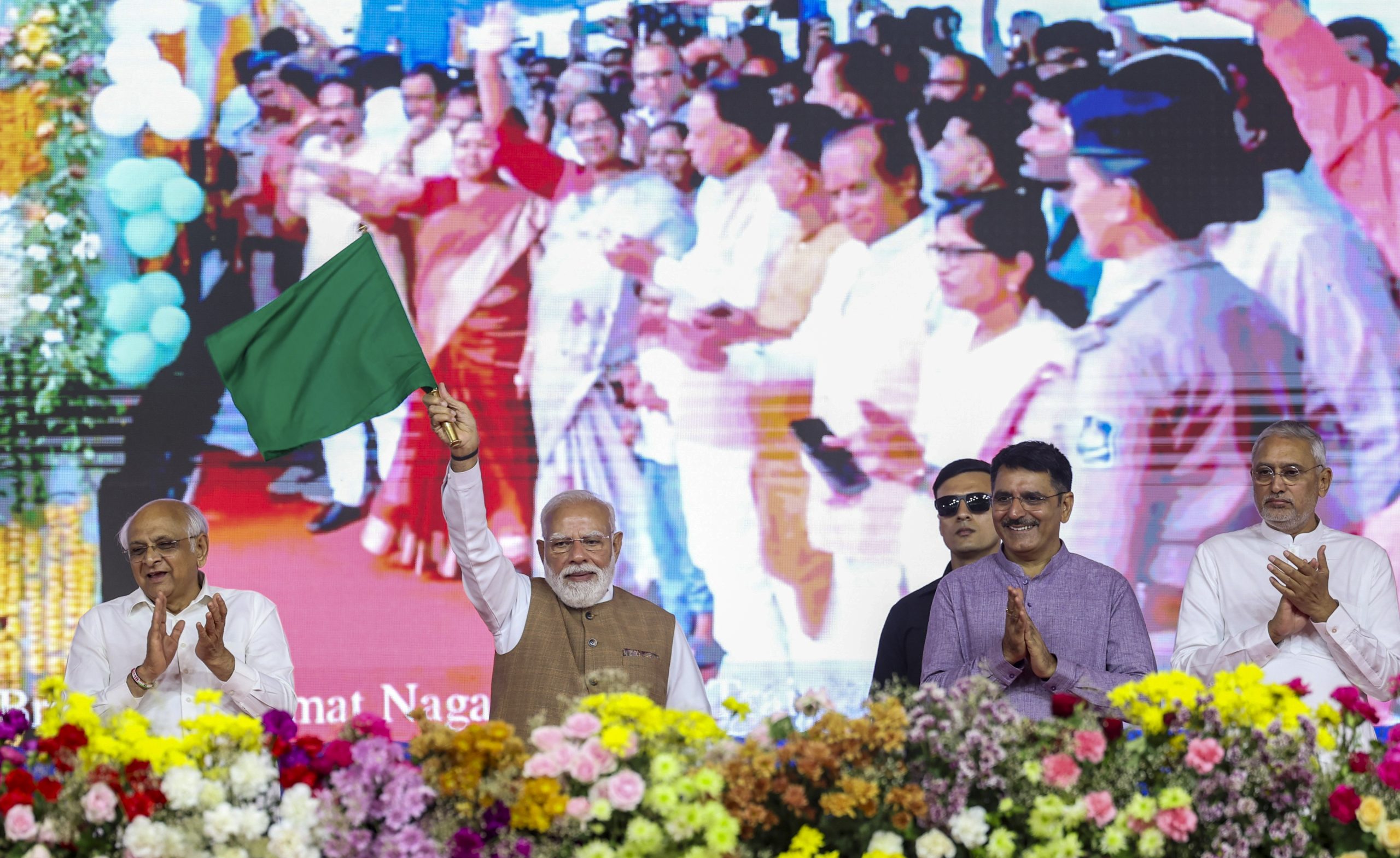 **EDS: THIRD PARTY IMAGE; TO GO WITH STORY** In this image released on March 31, 2026, Prime Minister Narendra Modi, Gujarat Assembly Speaker Shankar Chaudhary, Chief Minister Bhupendra Patel and others during the foundation stone laying and inauguration of various projects at a public meeting at Nani village, in Vav-Tharad district. (PMO via PTI Photo) (PTI03_31_2026_000347B) *** Local Caption ***