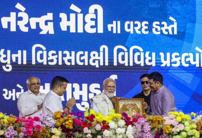 **EDS: THIRD PARTY IMAGE; TO GO WITH STORY** In this image released on March 31, 2026, Prime Minister Narendra Modi is being felicitated by Gujarat Assembly Speaker Shankar Chaudhary, Chief Minister Bhupendra Patel and Deputy CM Harsh Sanghavi during a public meeting at Nani village, in Vav-Tharad district, Gujarat. (PMO via PTI Photo) (PTI03_31_2026_000348B) *** Local Caption ***
