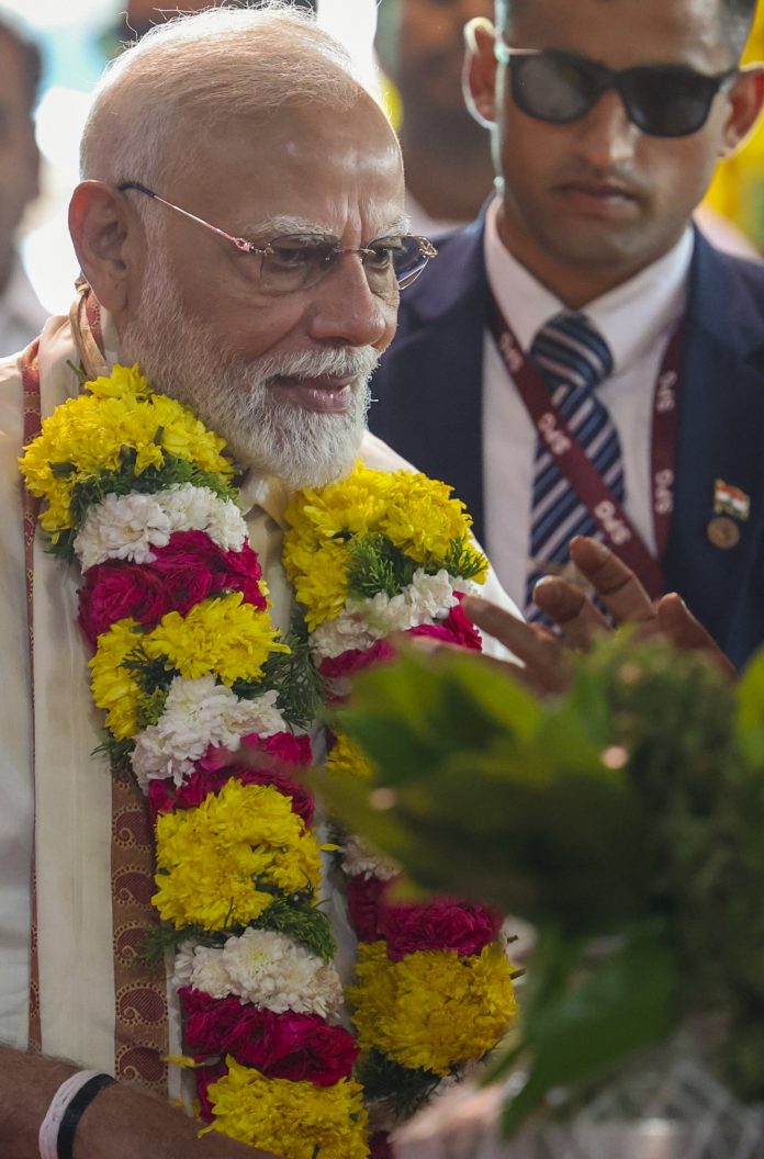 **EDS: THIRD PARTY** In this image provided by PMO on April 6, 2025, Prime Minister Narendra Modi at the Ramanathaswamy Temple, in Rameswaram, Tamil Nadu. (PMO via PTI Photo) (PTI04_06_2025_000196B)