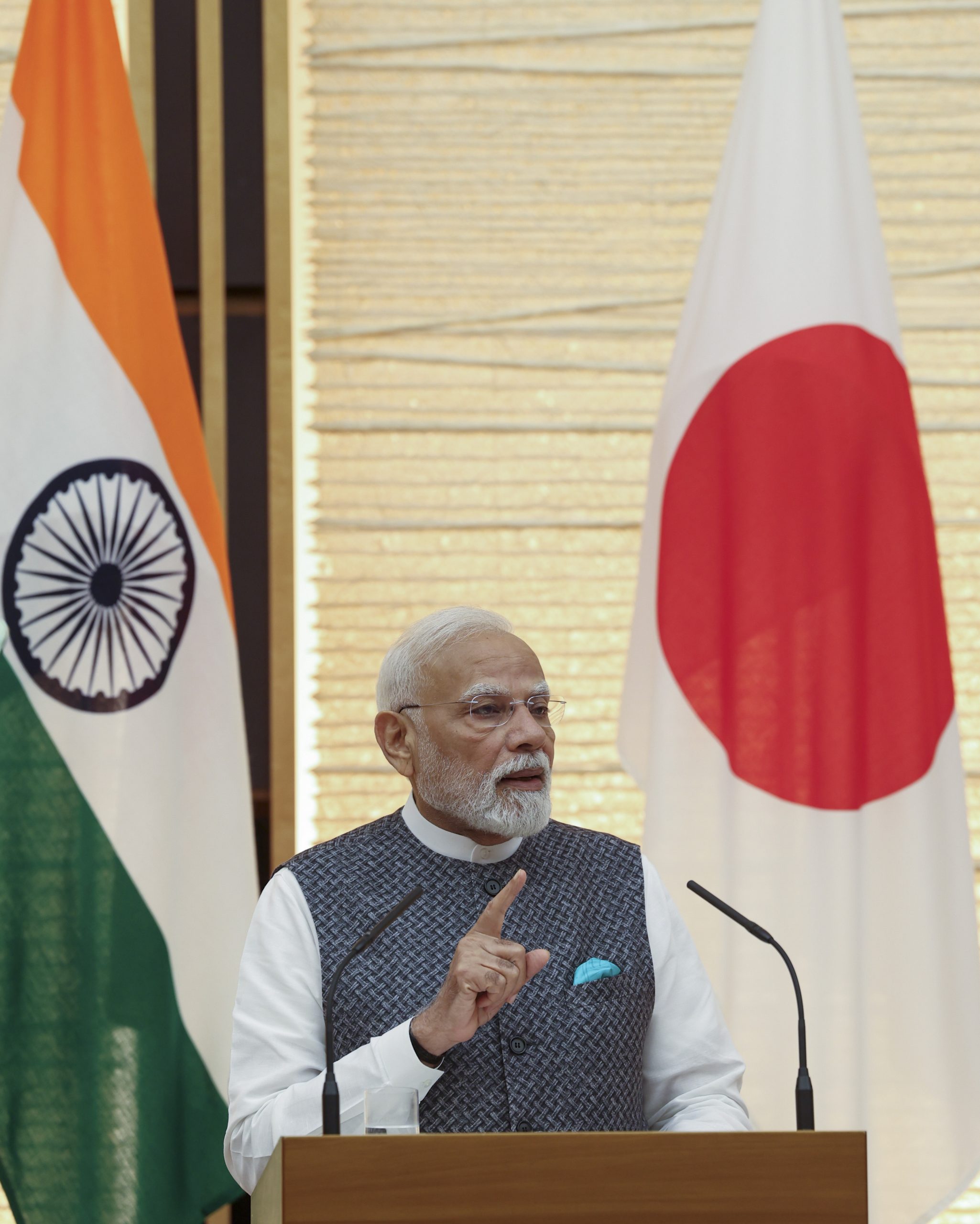 **EDS: THIRD PARTY IMAGE** In this image released on Aug. 29, 2025, Prime Minister Narendra Modi addresses a joint press conference with his Japanese counterpart Shigeru Ishiba after their meeting, in Tokyo, Japan. (PMO via PTI Photo) (PTI08_29_2025_000394B)