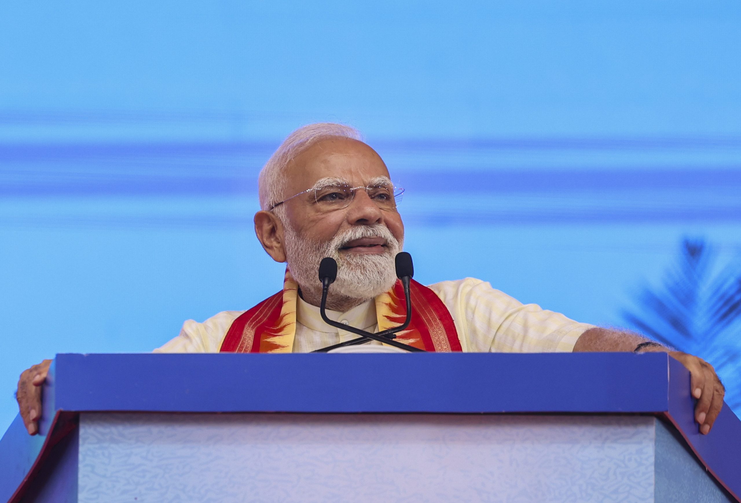 **EDS: THIRD PARTY IMAGE** In this image received on Aug. 25, 2025, Prime Minister Narendra Modi addresses the gathering during the inauguration and foundation stone laying ceremony of development projects, at Khodaldham ground, in Ahmedabad. (PMO via PTI Photo)(PTI08_25_2025_000421B)