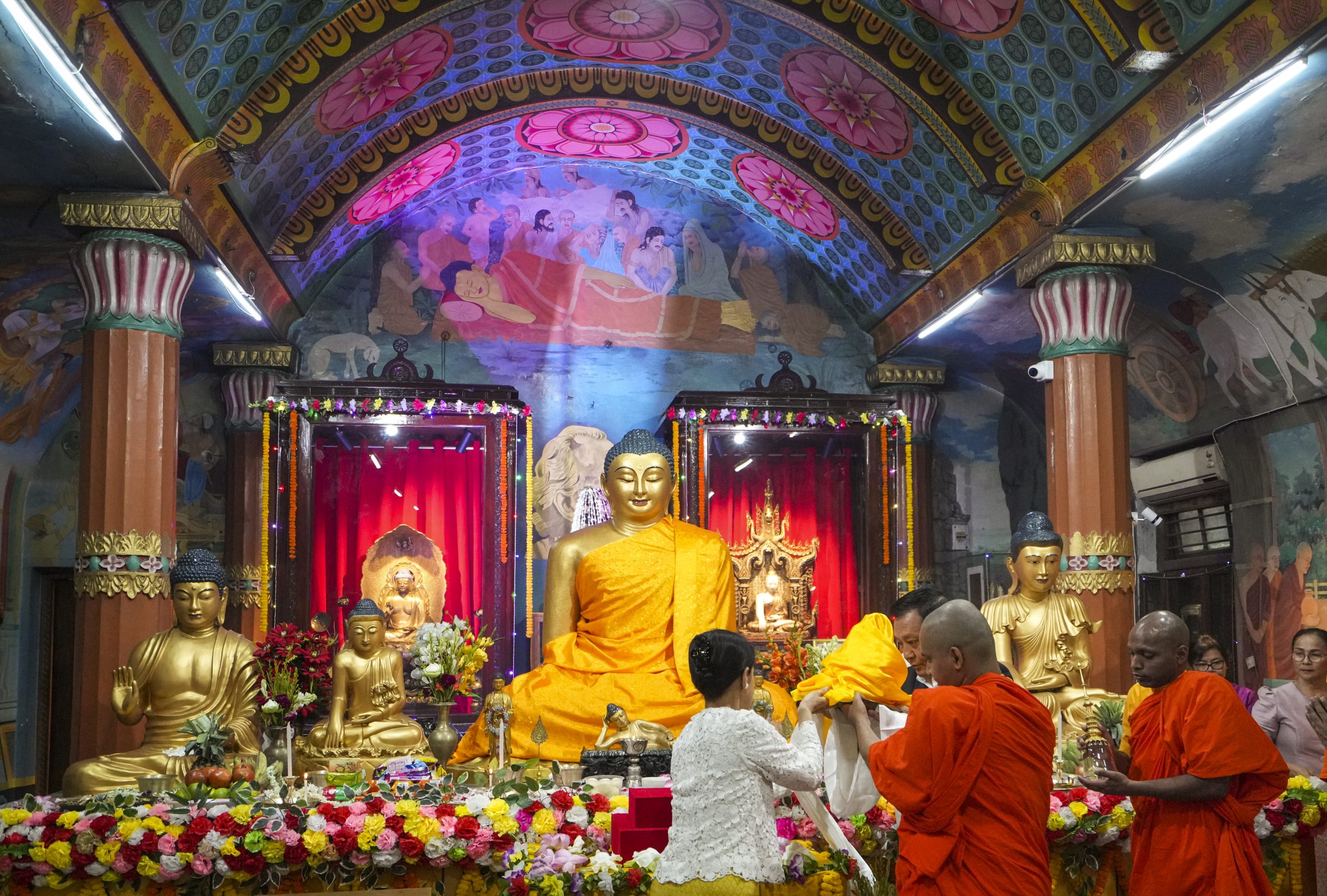 Kolkata: Devotees pray in front of a statue of Lord Buddha at the Mahabodhi Society Temple in Kolkata, West Bengal, Monday, May 12, 2025. Buddhists on Monday observed Buddha Jayanti, marking the birth anniversary of Lord Buddha and the day he attained enlightenment. (PTI Photo/Swapan Mahapatra) (PTI05_12_2025_000052B)