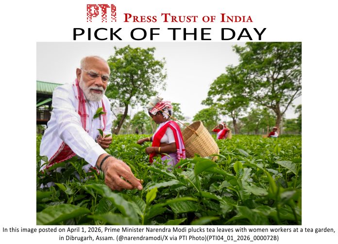 PLS TAKE NOTE OF THIS PTI PICK OF THE DAY::: **EDS: THIRD PARTY IMAGE** In this image posted on April 1, 2026, Prime Minister Narendra Modi plucks tea leaves with women workers at a tea garden, in Dibrugarh, Assam. (@narendramodi/X via PTI Photo)(PTI04_01_2026_000072B)(PTI04_01_2026_000395B)