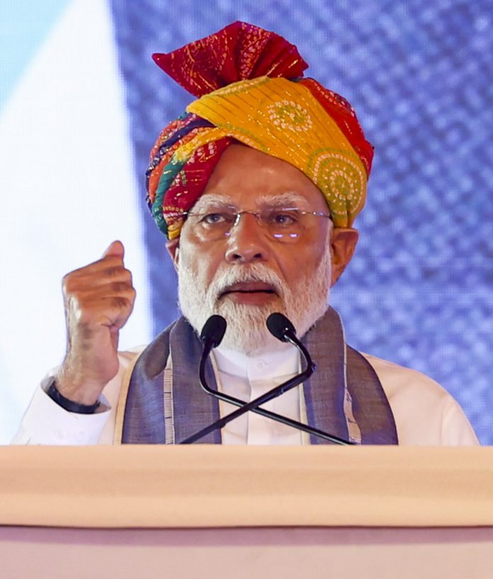 **EDS: THIRD PARTY IMAGE** In this image via PMO on Monday, April 14, 2025, Prime Minister Narendra Modi addresses a public meeting, in Hisar, Haryana. PM Modi laid the foundation stone of new terminal building of Hisar airport and flagged off a commercial flight from Hisar to Ayodhya. (PMO via PTI Photo)(PTI04_14_2025_000117B)