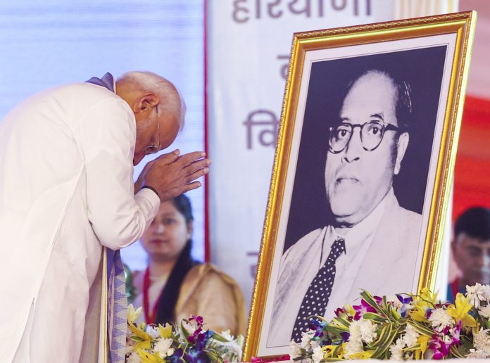 **EDS: THIRD PARTY IMAGE** In this image via PMO on Monday, April 14, 2025, Prime Minister Narendra Modi pays tribute to BR Ambedkar on his birth anniversary, during a public meeting, in Hisar, Haryana. PM Modi laid the foundation stone of new terminal building of Hisar airport and flagged off a commercial flight from Hisar to Ayodhya. (PMO via PTI Photo)(PTI04_14_2025_000107B)