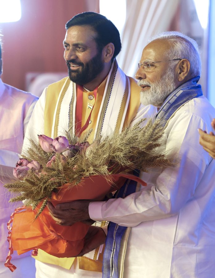 **EDS: THIRD PARTY IMAGE** In this image via PMO on Monday, April 14, 2025, Prime Minister Narendra Modi with Haryana Chief Minister Nayab Singh Saini during a public meeting, in Hisar, Haryana. PM Modi laid the foundation stone of new terminal building of Hisar airport and flagged off a commercial flight from Hisar to Ayodhya. (PMO via PTI Photo)(PTI04_14_2025_000090B)