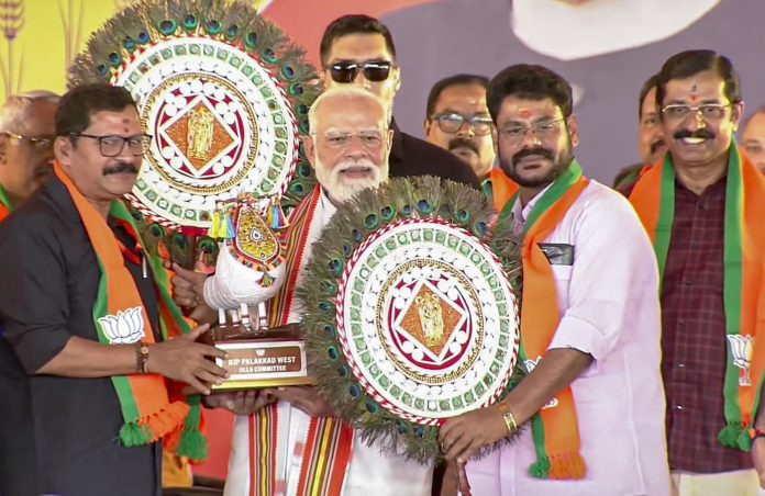 **EDS: THIRD PARTY IMAGE** In this screengrab from a video posted on March 29, 2026, Prime Minister Narendra Modi being felicitated during a public meeting, in Palakkad, Kerala. (@NarendraModi/YT via PTI Photo)(PTI03_29_2026_000160B)