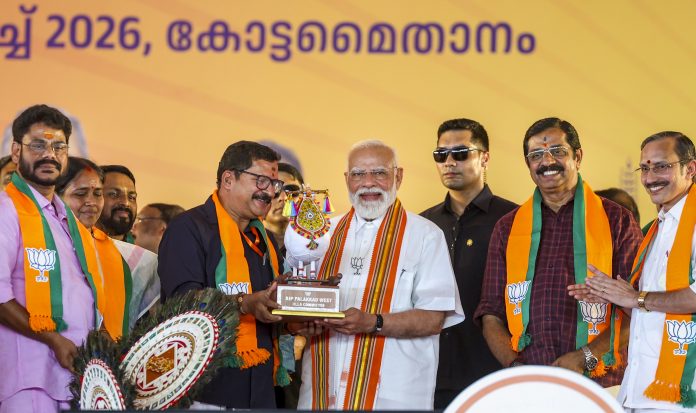 **EDS: THIRD PARTY IMAGE** In this image received on March 29, 2026, Prime Minister Narendra Modi being felicitated during a public meeting, in Palakkad, Kerala. (narendramodi.in via PTI Photo)(PTI03_29_2026_000197B)