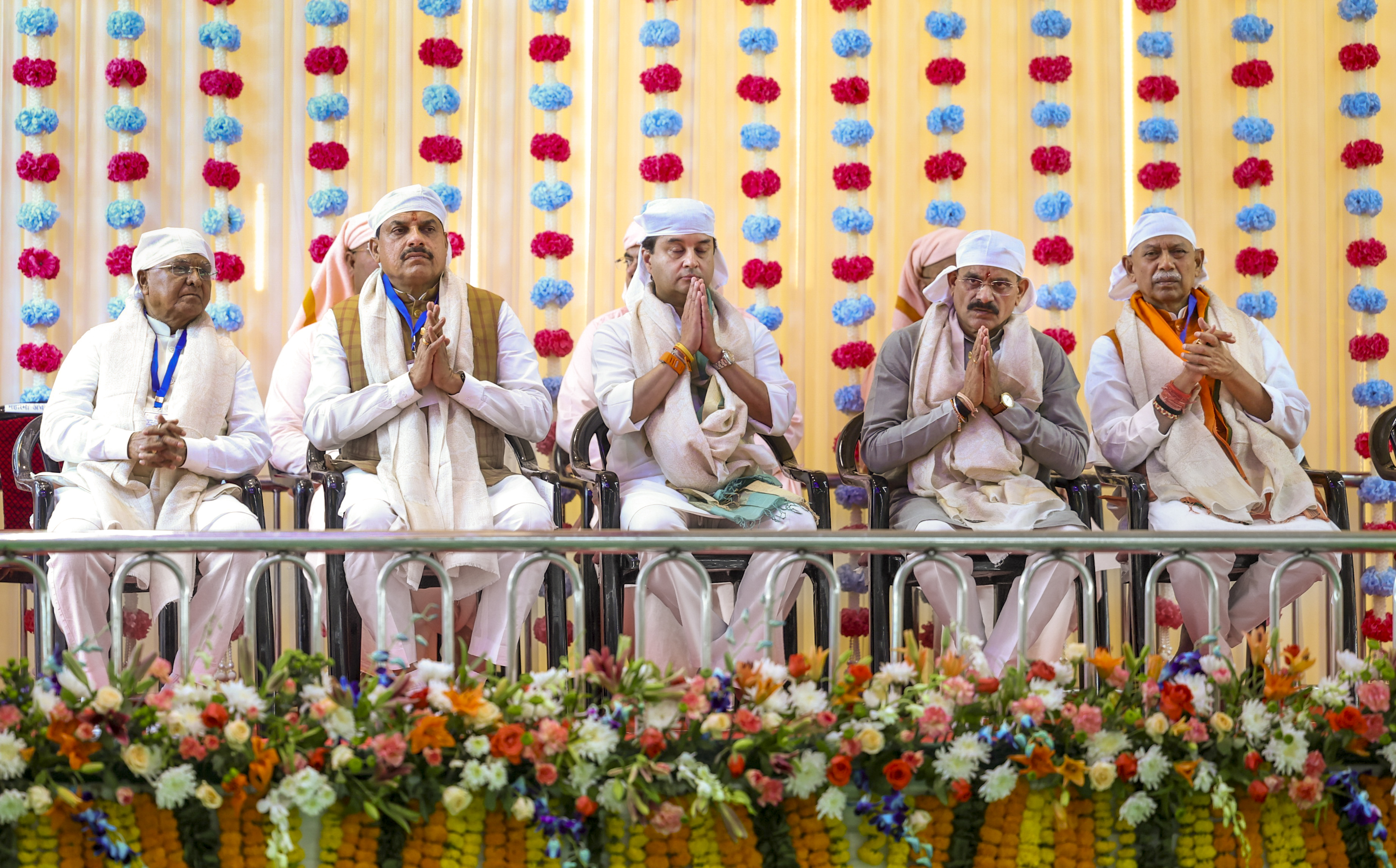 **EDS: THIRD PARTY IMAGE** In this image released by PMO on April 11, 2025, Madhya Pradesh Governor Mangubhai Patel, Chief Minister Mohan Yadav, Union Minister Jyotiraditya Scindia, BJP state President VD Sharma and others during an event at Anandpur Dham, Isagarh, in Ashoknagar district, Madhya Pradesh. (PMO via PTI Photo) (PTI04_11_2025_000284B) *** Local Caption ***