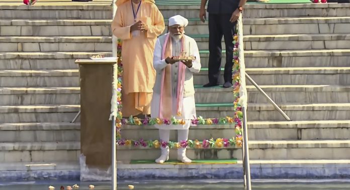 **EDS: THIRD PARTY** In this screenshot image from @Narendramodi via Youtube on Friday, April 11, 2025, Prime Minister Narendra Modi performs ‘pooja’ at Shri Anandpur Dham, in Ashoknagar, Madhya Pradesh. (@Narendramodi/YT via PTI Photo) (PTI04_11_2025_000210B) *** Local Caption ***