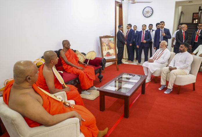 **EDS: THIRD PARTY** In this image provided by PMO via X on April 6, 2025, Prime Minister Narednra Modi with Sri Lankan Executive President Anura Kumara Dissanayake at the Jaya Sri Maha Bodhi, in Anuradhapura, Sri Lanka. (PMO via PTI Photo)(PTI04_06_2025_000042B)