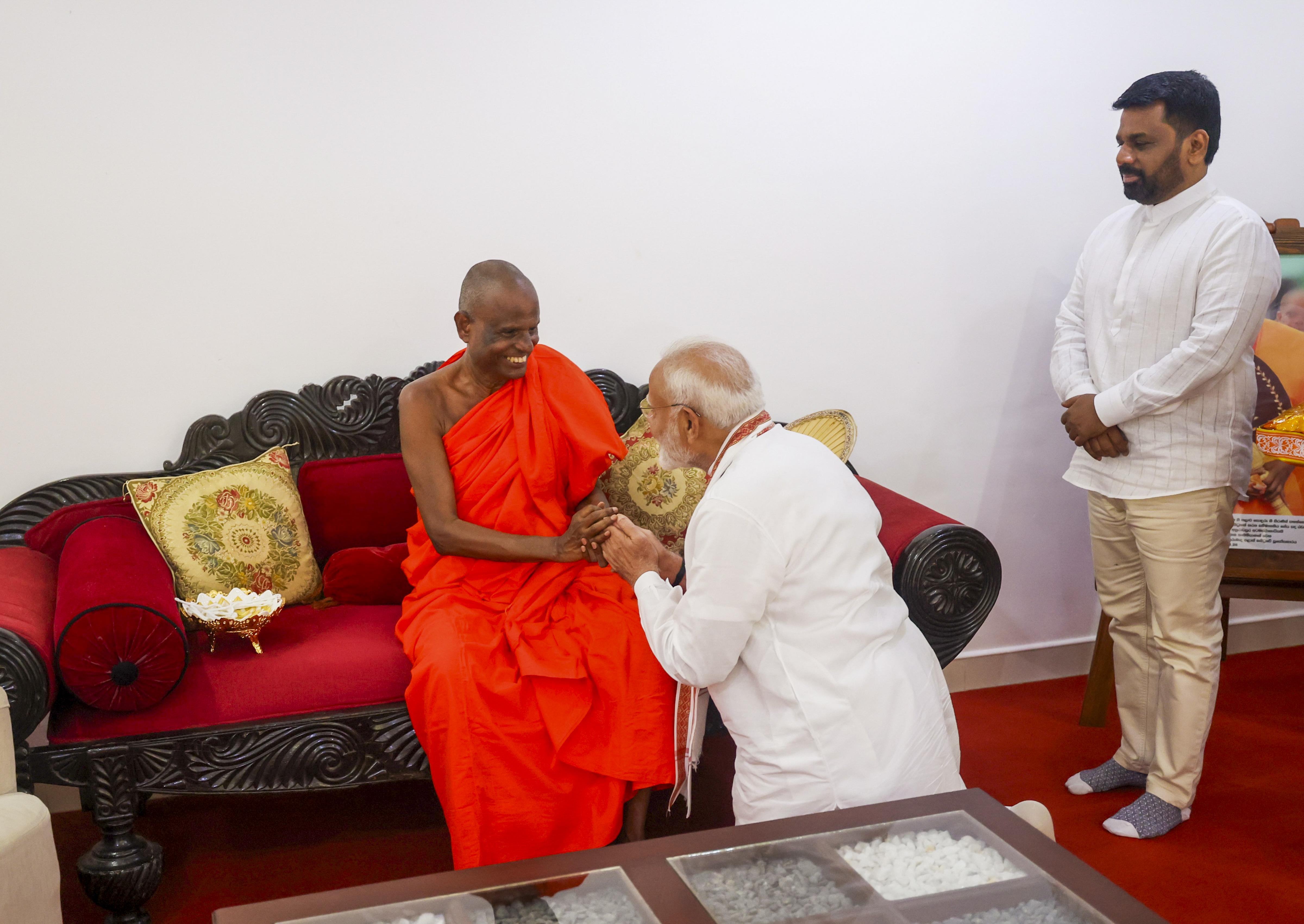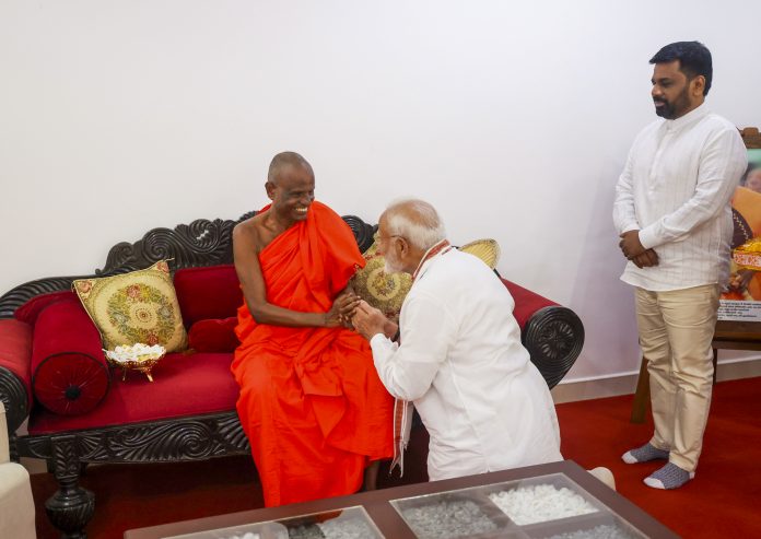 **EDS: CORRECTS DETAILS; THIRD PARTY** In this image provided by PMO via X on April 6, 2025, Prime Minister Narednra Modi with Sri Lankan President Anura Kumara Dissanayake at the Jaya Sri Maha Bodhi, in Anuradhapura, Sri Lanka. (PMO via PTI Photo)(PTI04_06_2025_RPT035B)