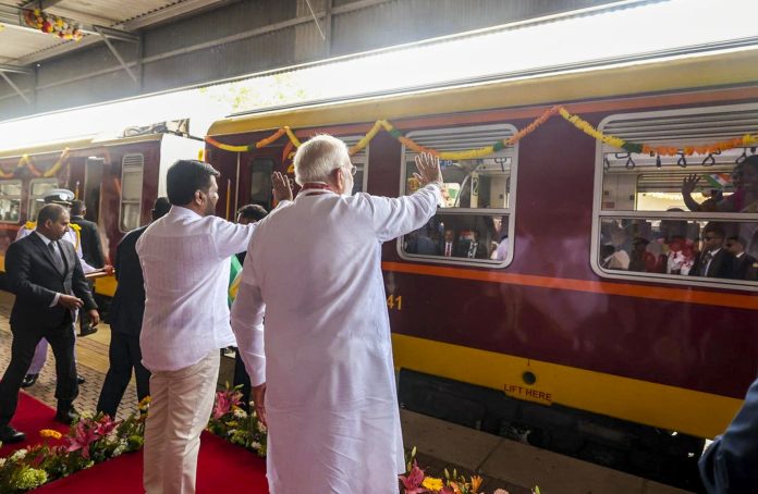 **EDS: CORRECTS DETAILS; THIRD PARTY** In this image posted by @MEAIndia via X on April 6, 2025, Prime Minister Narendra Modi and Sri Lankan President Anura Kumara Dissanayake during the inauguration of India-assisted railway modernisation projects in Anuradhapura, Sri Lanka. (@MEAIndia via PTI Photo) (PTI04_06_2025_RPT020B)