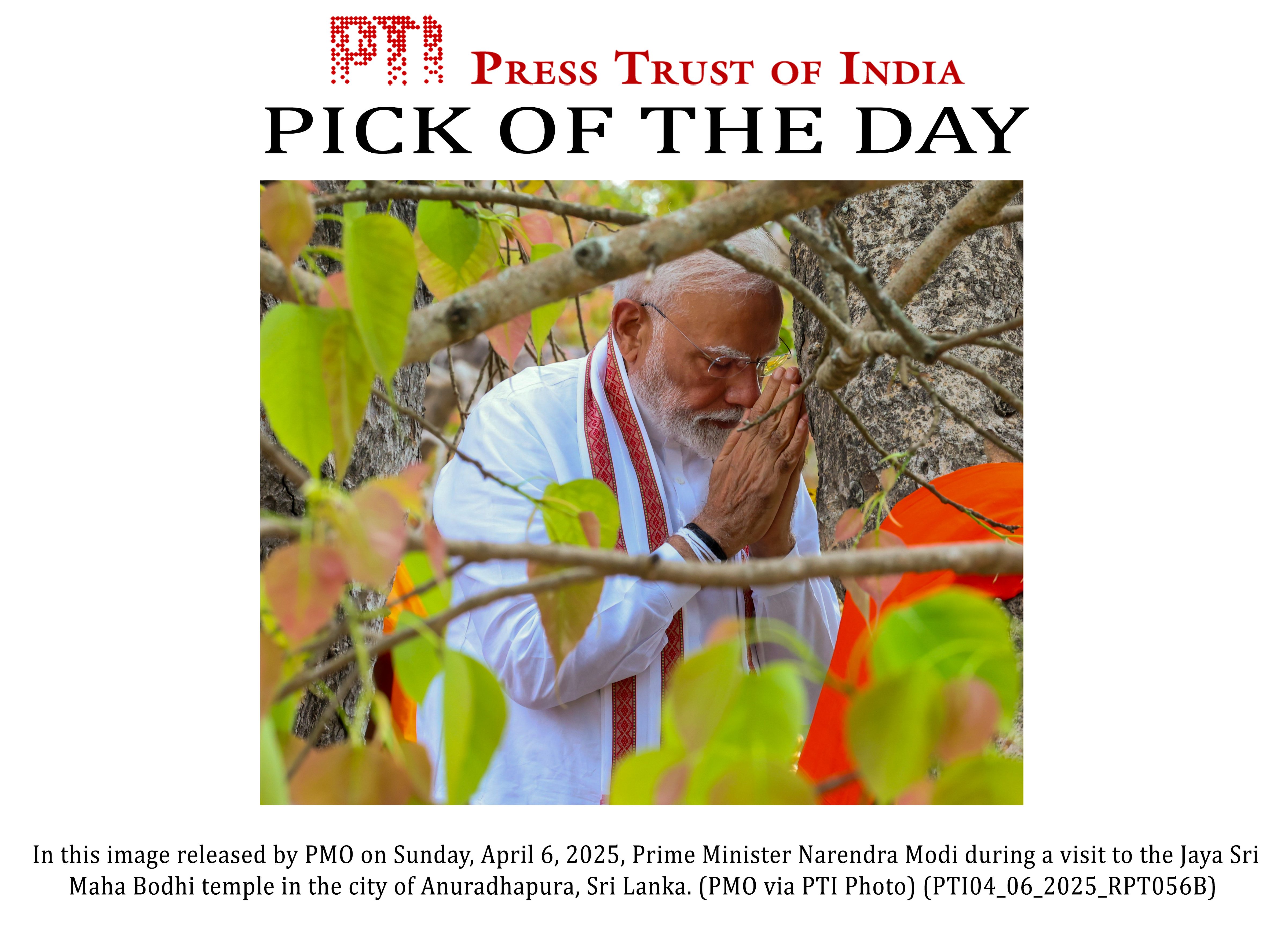 PLS TAKE NOTE OF THIS PTI PICK OF THE DAY:::**EDS: RPT, CORRECTS DAY IN CAPTION; THIRD PARTY IMAGE** In this image released by PMO on Sunday, April 6, 2025, Prime Minister Narendra Modi during a visit to the Jaya Sri Maha Bodhi temple in the city of Anuradhapura, Sri Lanka. (PMO via PTI Photo) (PTI04_06_2025_RPT056B)(PTI04_06_2025_000287B)