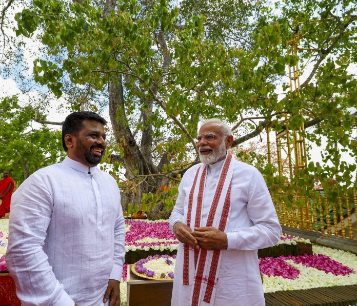 **EDS: THIRD PARTY** In this image provided by @narendramodi via X on April 6, 2025, Prime Minister Narednra Modi with Sri Lankan Executive President Anura Kumara Dissanayake at the Jaya Sri Maha Bodhi, in Anuradhapura, Sri Lanka. (@narendramodi via PTI Photo)(PTI04_06_2025_000031B)