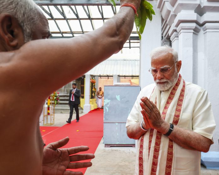 **EDS: THIRD PARTY IMAGE** In this image released by PMO on April 6, 2025, Prime Minister Narendra Modi during a visit to Sri Arulmigu Ramanathaswamy Temple, in Rameswaram, Tamil Nadu. (PMO via PTI Photo) (PTI04_06_2025_000216B)