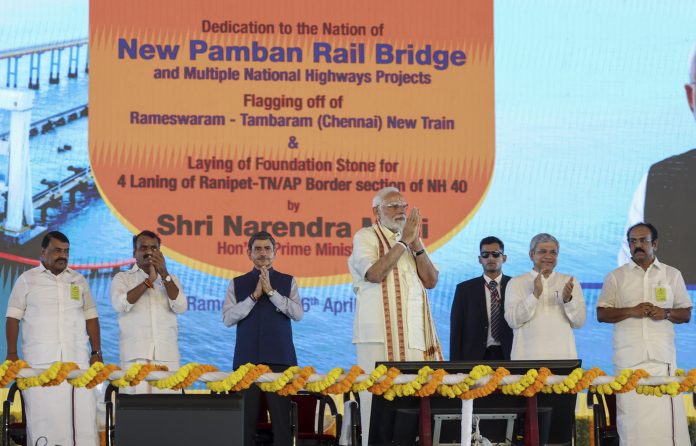 **EDS: THIRD PARTY IMAGE** In this image released by PMO on April 6, 2025, Prime Minister Narendra Modi, Tamil Nadu Governor RN Ravi, Union Railways Minister Ashwini Vaishnaw and others during the inauguration of the Pamban sea bridge and flagging off of the new Rameswaram-Tambaram (Chennai) train service, in Rameswaram, Tamil Nadu. (PMO via PTI Photo) (PTI04_06_2025_000191B)