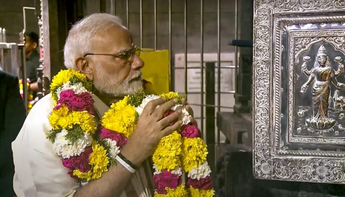 **EDS: THIRD PARTY IMAGE** In this screengrab from a video posted by PM India website on April 6, 2025, Prime Minister Narendra Modi offers prayers at Sri Arulmigu Ramanathaswamy Temple, in Rameswaram, Tamil Nadu. (PM India via PTI Photo) (PTI04_06_2025_000125B)