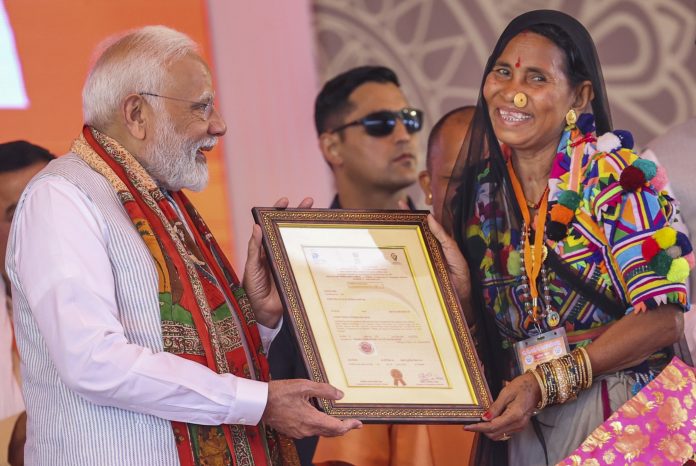 **EDS: THIRD PARTY IMAGE** In this image by PMO on Friday, April 11, 2025, Prime Minister Narendra Modi during laying of foundation stone and inauguration of various projects, in Varanasi. (PMO via PTI Photo)