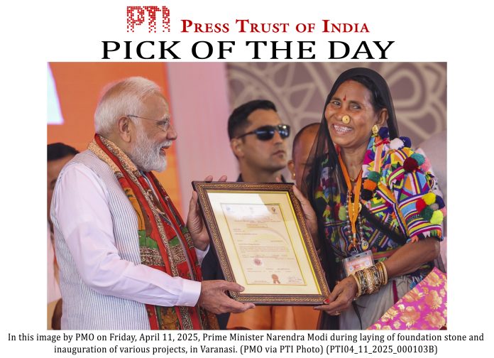 PLS TAKE NOTE OF THIS PTI PICK OF THE DAY::: **EDS: THIRD PARTY IMAGE** In this image by PMO on Friday, April 11, 2025, Prime Minister Narendra Modi during laying of foundation stone and inauguration of various projects, in Varanasi. (PMO via PTI Photo)