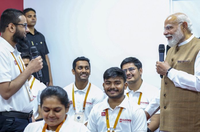 **EDS: THIRD PARTY IMAGE** In this image received on March 31, 2026, Prime Minister Narendra Modi interacts with operators and engineers during the inauguration of Kaynes Semicon’s OSAT facility at Sanand, in Ahmedabad district of Gujarat. (PMO via PTI Photo)(PTI03_31_2026_000184B)