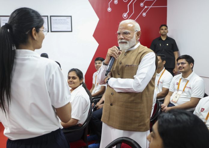 **EDS: THIRD PARTY IMAGE** In this image received on March 31, 2026, Prime Minister Narendra Modi interacts with operators and engineers during the inauguration of Kaynes Semicon’s OSAT facility at Sanand, in Ahmedabad district of Gujarat. (PMO via PTI Photo)(PTI03_31_2026_000187B)