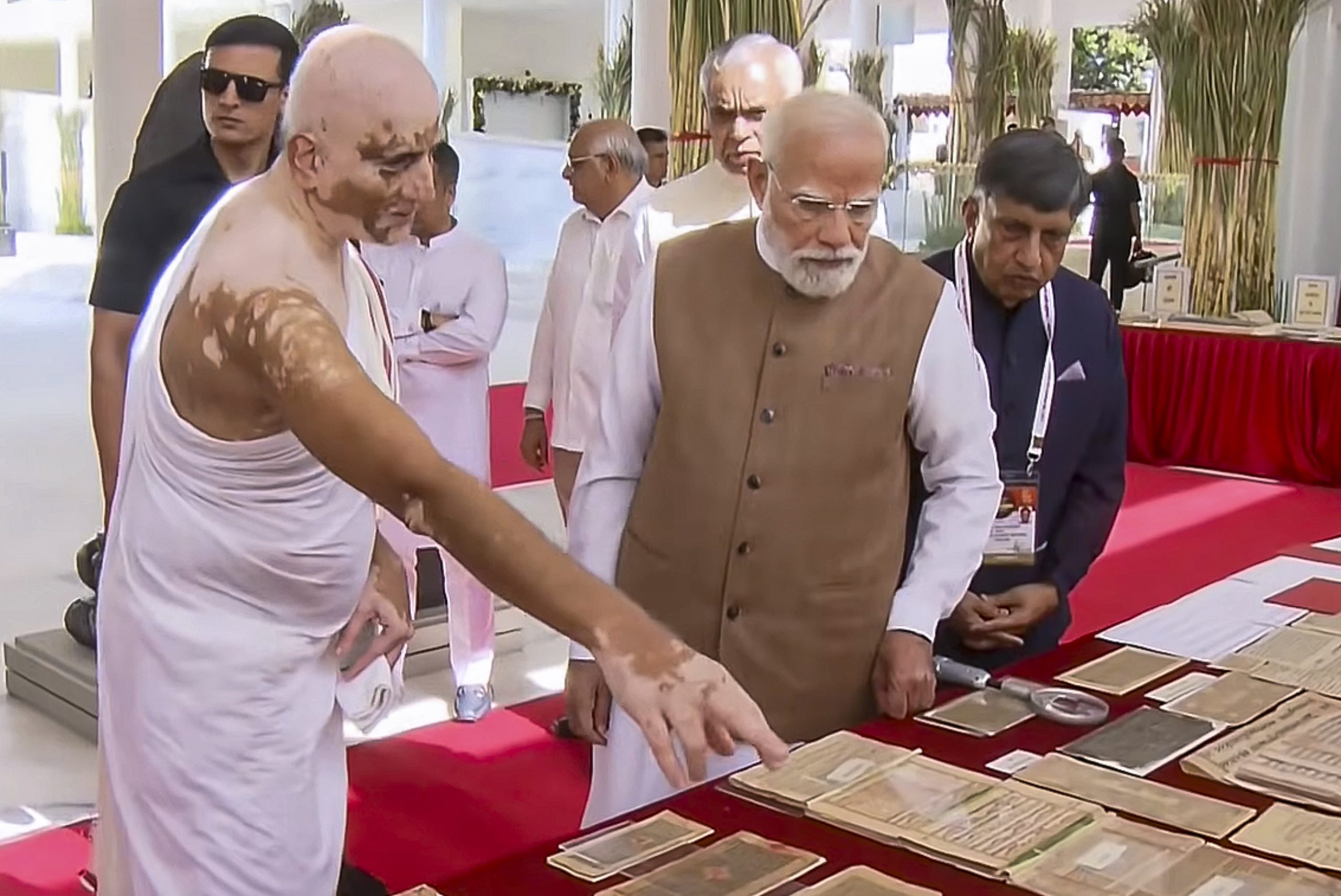 **EDS: THIRD PARTY IMAGE** In this screengrab from a video posted on March 31, 2026, Prime Minister Narendra Modi views ancient manuscripts during the inauguration of the Samrat Samprati Museum, in Gandhinagar, Gujarat. (@NarendraModi/YT via PTI Photo)(PTI03_31_2026_000037B)