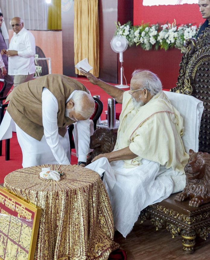 **EDS: THIRD PARTY IMAGE** In this image posted on March 31, 2026, Prime Minister Narendra Modi seeks blessings from Acharya Shri Padma Sagar Surishwarji Maharaj during the inauguration of the Samrat Samprati Museum, in Gandhinagar, Gujarat. (@NarendraModi/X via PTI Photo)(PTI03_31_2026_000082B)