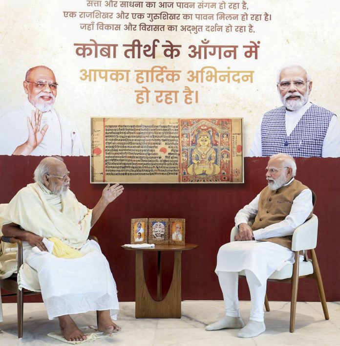 **EDS: THIRD PARTY IMAGE** In this image posted on March 31, 2026, Prime Minister Narendra Modi with Acharya Shri Padma Sagar Surishwarji Maharaj during the inauguration of the Samrat Samprati Museum, in Gandhinagar, Gujarat. (@NarendraModi/X via PTI Photo)(PTI03_31_2026_000083B)