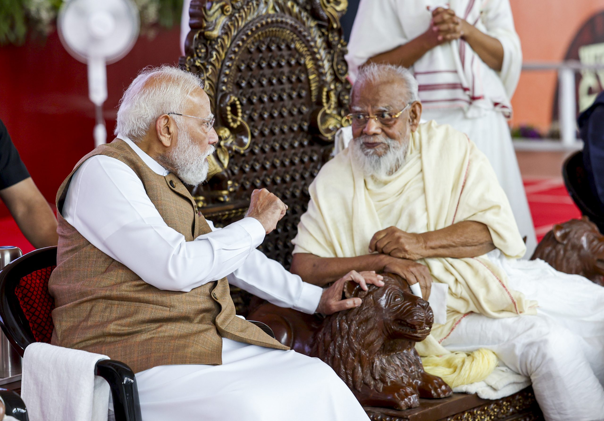 **EDS: THIRD PARTY IMAGE** In this image received on March 31, 2026, Prime Minister Narendra Modi with Acharya Shri Padma Sagar Surishwarji Maharaj during the inauguration of the Samrat Samprati Museum, in Gandhinagar, Gujarat. (PMO via PTI Photo)(PTI03_31_2026_000103B)