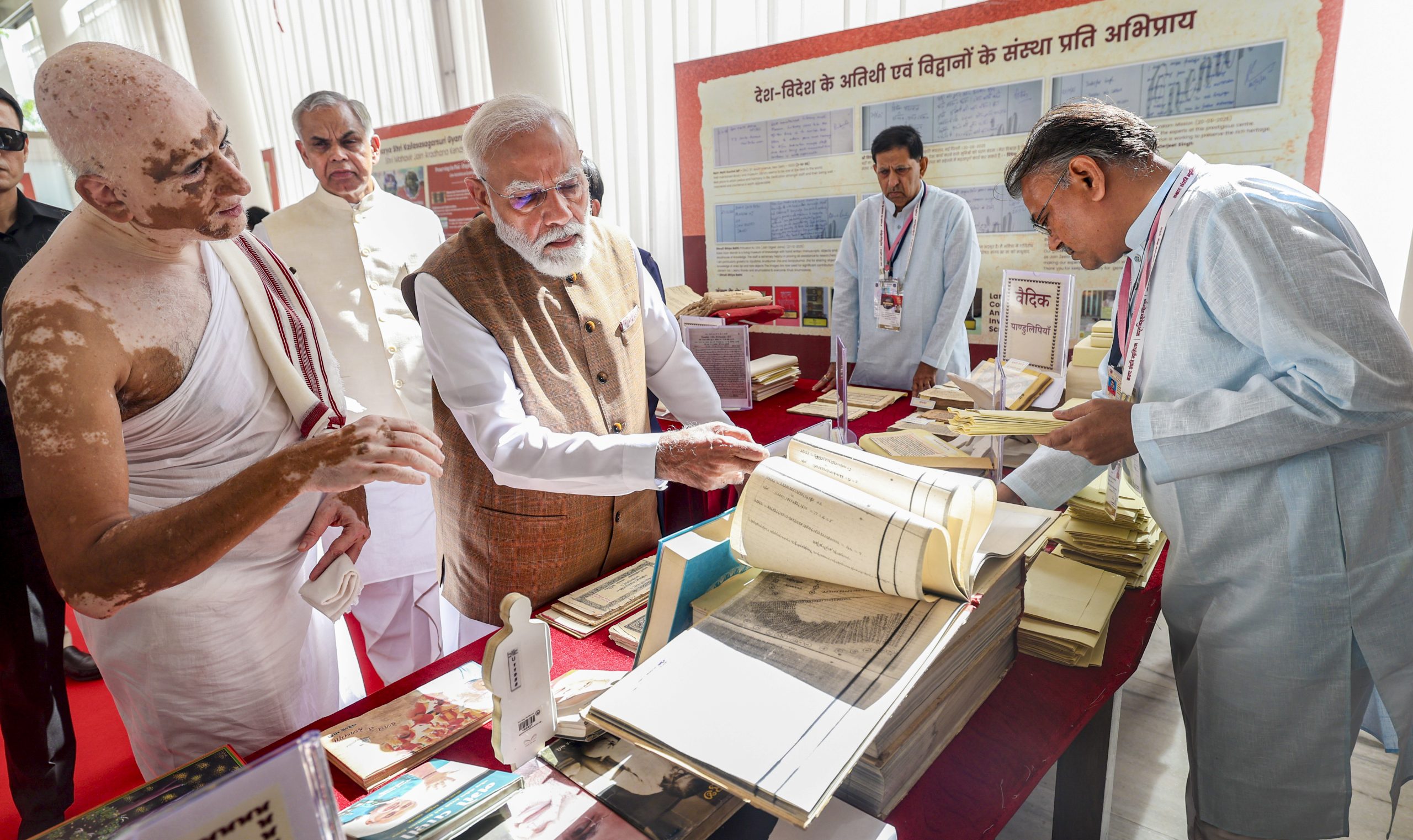 **EDS: THIRD PARTY IMAGE** In this image received on March 31, 2026, Prime Minister Narendra Modi views ancient manuscripts during the inauguration of the Samrat Samprati Museum, in Gandhinagar, Gujarat. (PMO via PTI Photo)(PTI03_31_2026_000117B)