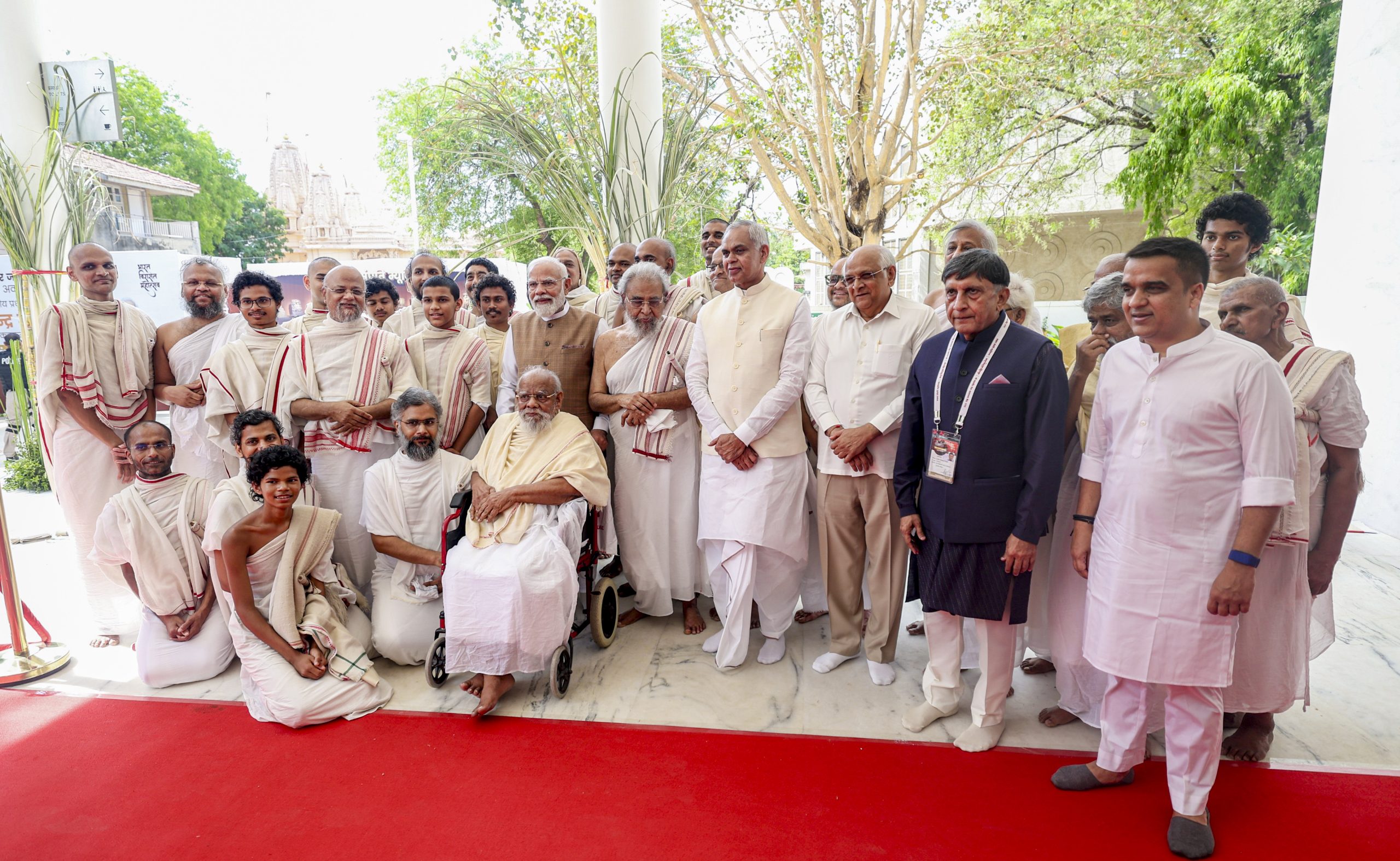 **EDS: THIRD PARTY IMAGE** In this image received on March 31, 2026, Prime Minister Narendra Modi, Acharya Shri Padma Sagar Surishwarji Maharaj, Gujarat Chief Minister Bhupendra Patel, Deputy Chief Minister Harsh Sanghavi, Governor Acharya Devvrat and others pose for a group photograph during the inauguration of the Samrat Samprati Museum, in Gandhinagar, Gujarat. (PMO via PTI Photo)(PTI03_31_2026_000120B)