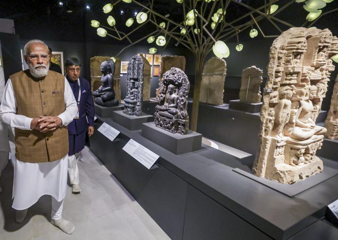 **EDS: THIRD PARTY IMAGE** In this image received on March 31, 2026, Prime Minister Narendra Modi views ancient sculptures during the inauguration of the Samrat Samprati Museum, in Gandhinagar, Gujarat. (PMO via PTI Photo)(PTI03_31_2026_000115B)