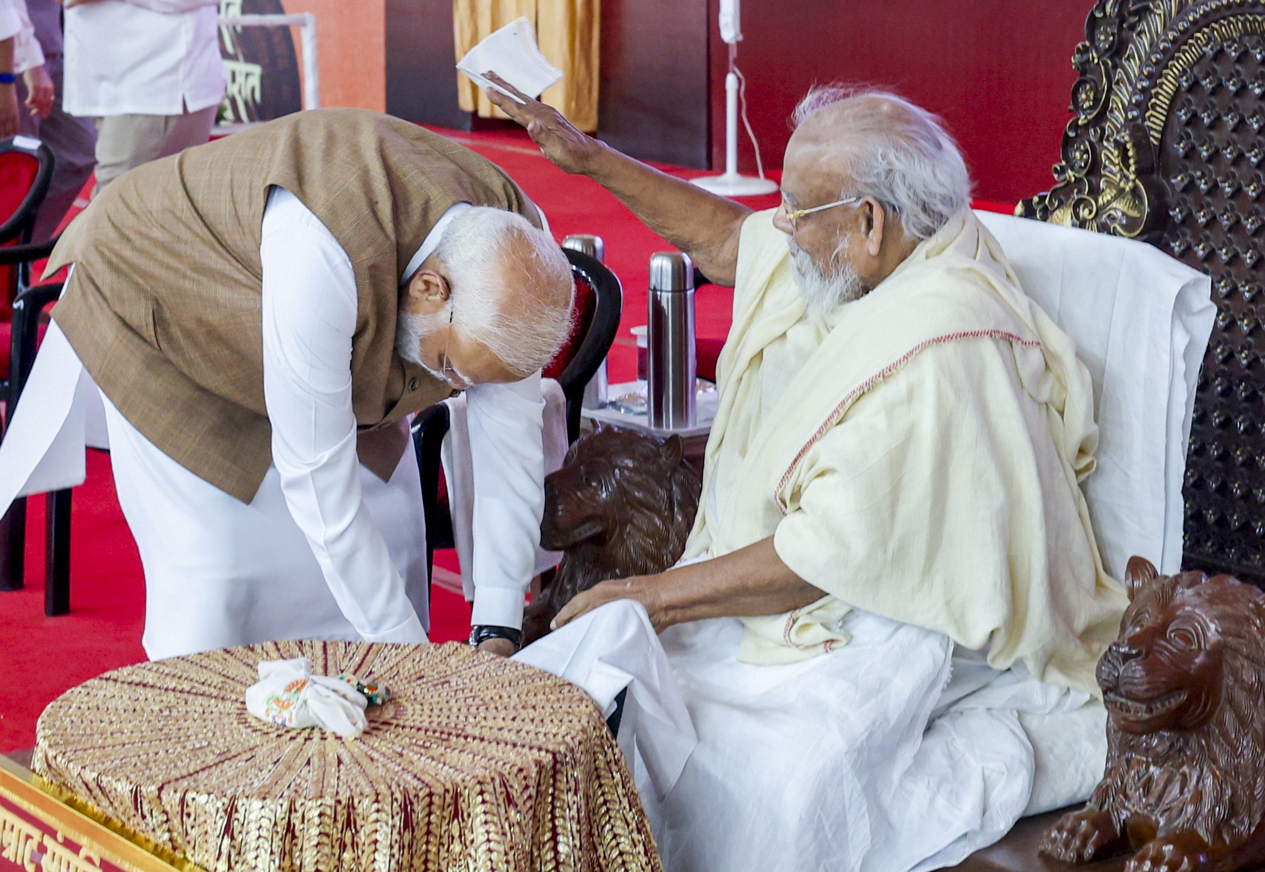 **EDS: THIRD PARTY IMAGE** In this image received on March 31, 2026, Prime Minister Narendra Modi seeks blessings from Acharya Shri Padma Sagar Surishwarji Maharaj during the inauguration of the Samrat Samprati Museum, in Gandhinagar, Gujarat. (PMO via PTI Photo)(PTI03_31_2026_000144B)