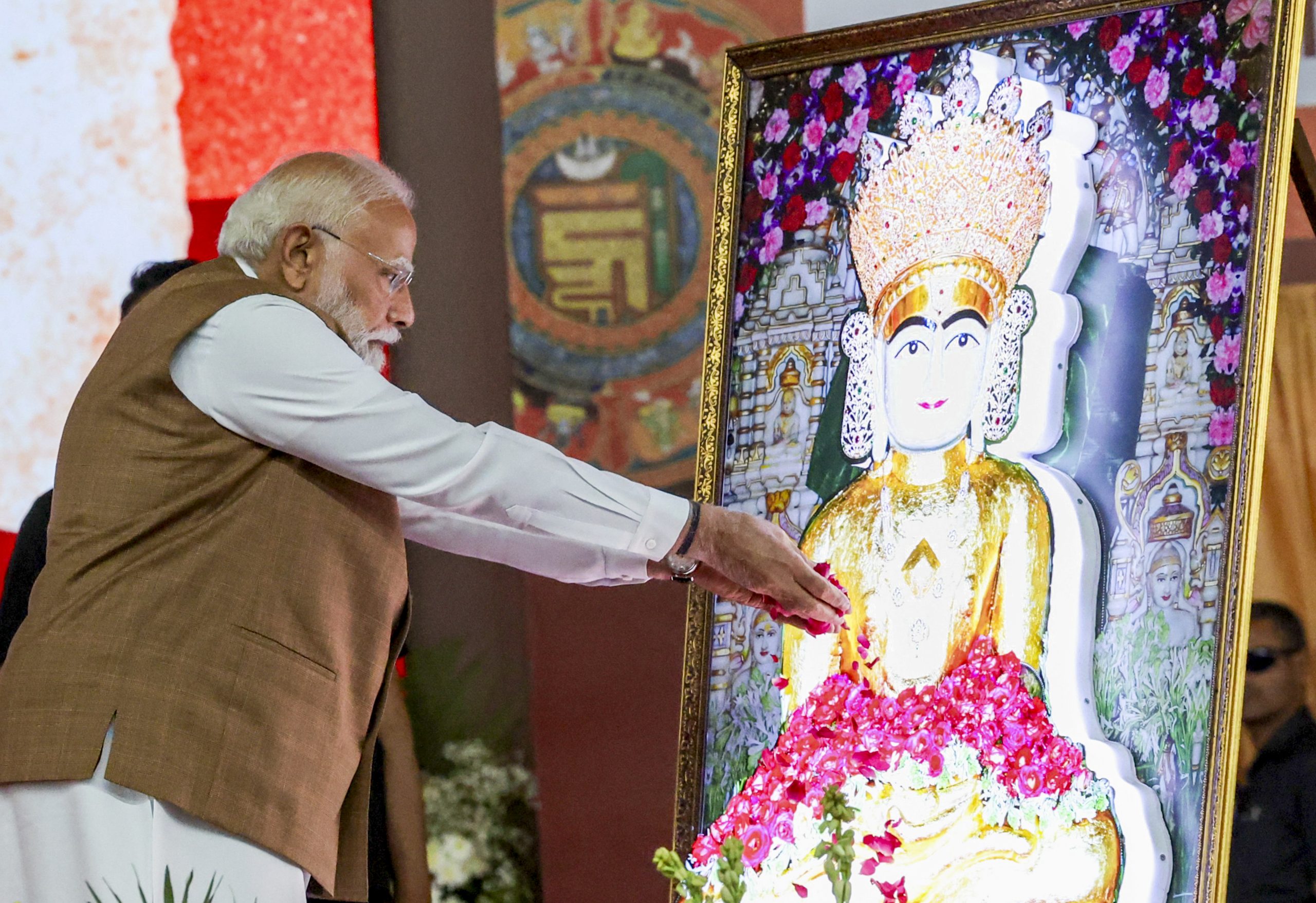 **EDS: THIRD PARTY IMAGE** In this image received on March 31, 2026, Prime Minister Narendra Modi pays floral tributes to Lord Mahavira on Mahavir Jayanti before inaugurating the Samrat Samprati Museum, in Gandhinagar, Gujarat. (PMO via PTI Photo)(PTI03_31_2026_000140B)