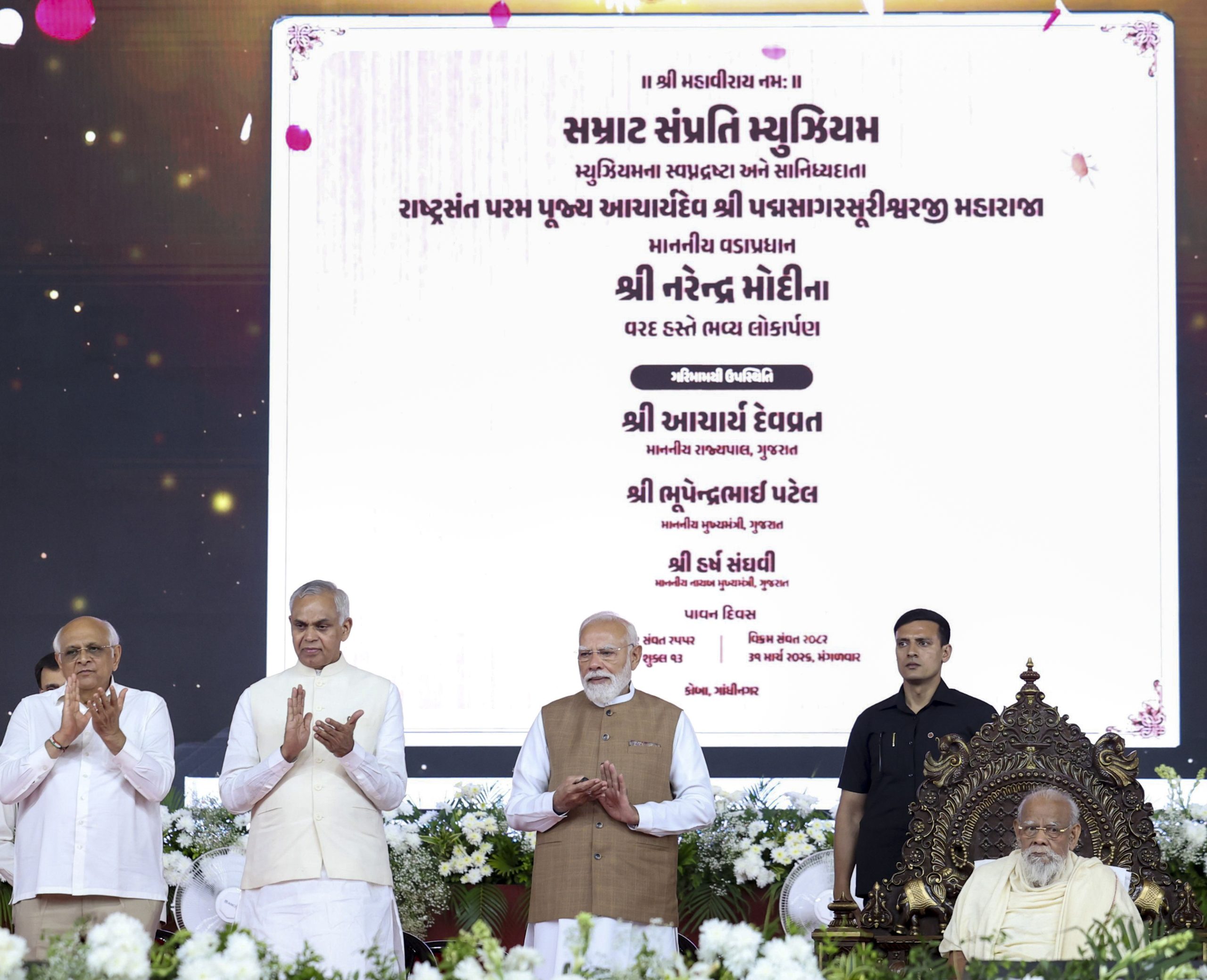 **EDS: THIRD PARTY IMAGE** In this image received on March 31, 2026, Prime Minister Narendra Modi inaugurates the Samrat Samprati Museum as Acharya Shri Padma Sagar Surishwarji Maharaj, Gujarat Chief Minister Bhupendra Patel, Governor Acharya Devvrat look on, in Gandhinagar, Gujarat. (PMO via PTI Photo)(PTI03_31_2026_000172B)