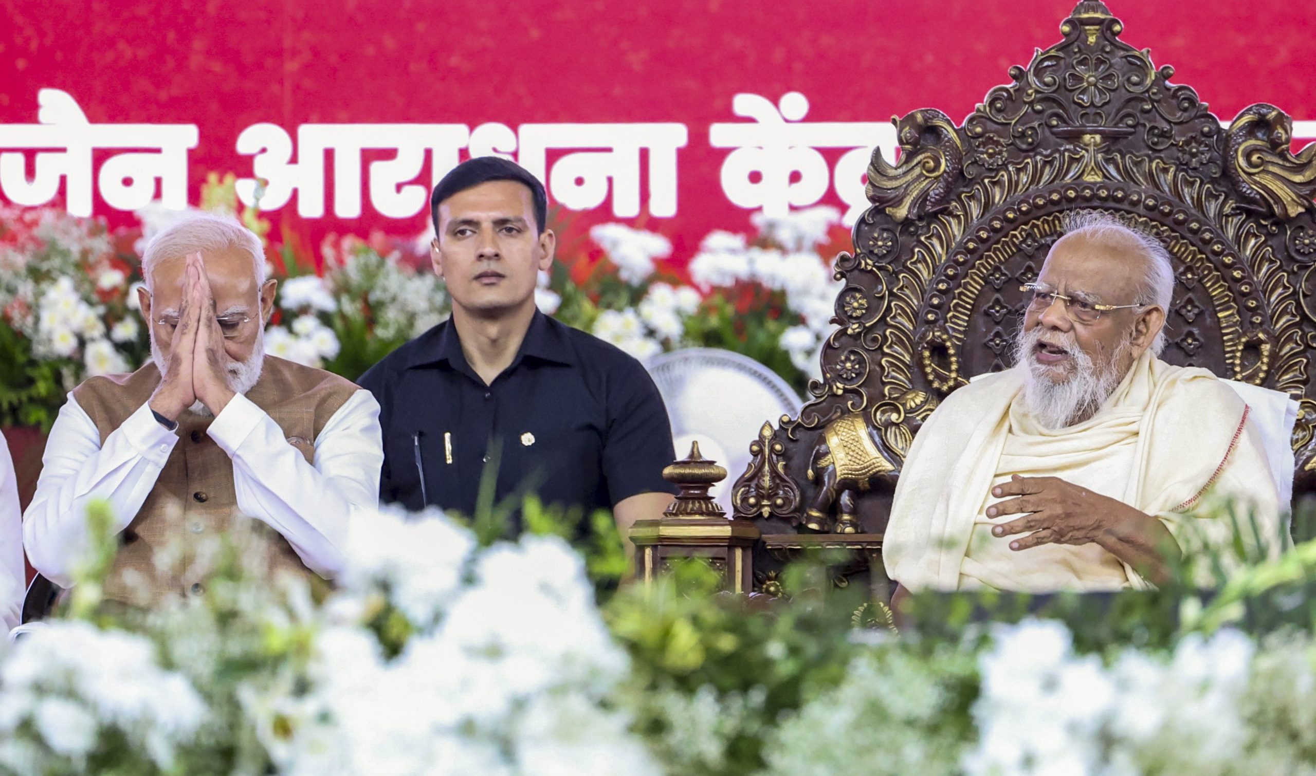 **EDS: THIRD PARTY IMAGE** In this image received on March 31, 2026, Prime Minister Narendra Modi with Acharya Shri Padma Sagar Surishwarji Maharaj during the inauguration of the Samrat Samprati Museum, in Gandhinagar, Gujarat. (PMO via PTI Photo)(PTI03_31_2026_000168B)
