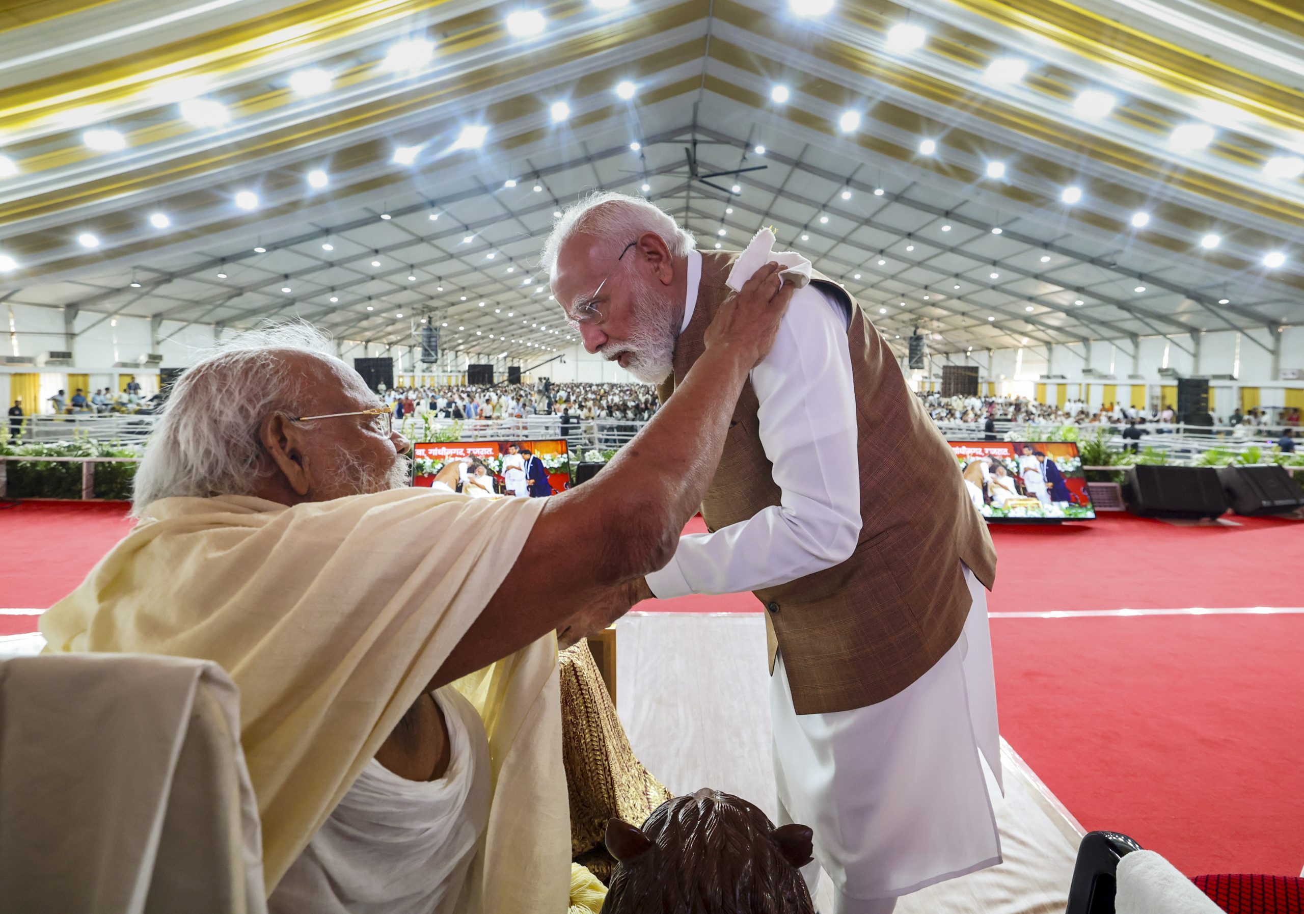 **EDS: THIRD PARTY IMAGE** In this image received on March 31, 2026, Prime Minister Narendra Modi with Acharya Shri Padma Sagar Surishwarji Maharaj during the inauguration of the Samrat Samprati Museum, in Gandhinagar, Gujarat. (PMO via PTI Photo)(PTI03_31_2026_000169B)