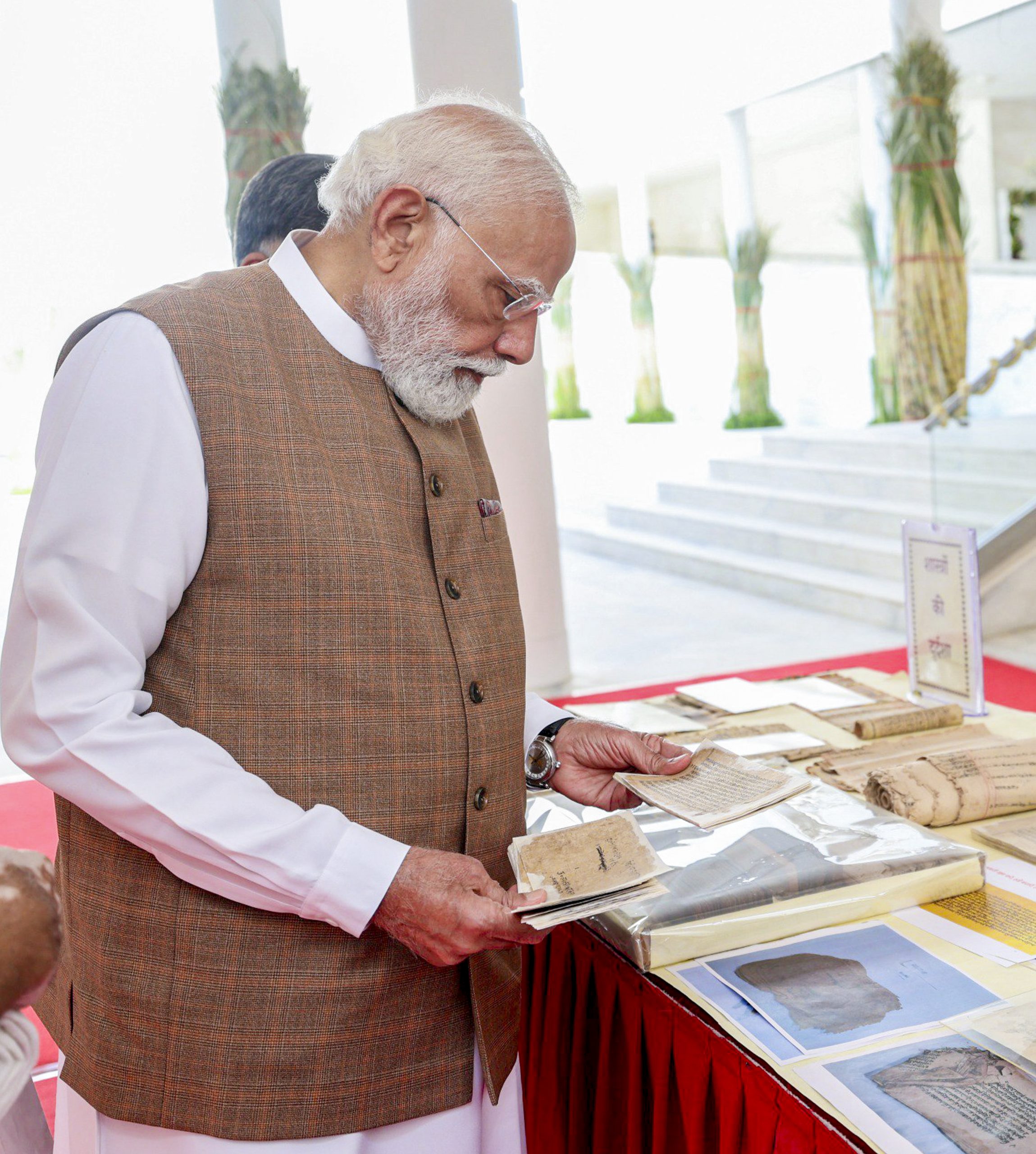 **EDS: THIRD PARTY IMAGE** In this image posted on March 31, 2026, Prime Minister Narendra Modi views ancient manuscripts during the inauguration of the Samrat Samprati Museum, in Gandhinagar, Gujarat. (@NarendraModi/X via PTI Photo)(PTI03_31_2026_000064B)