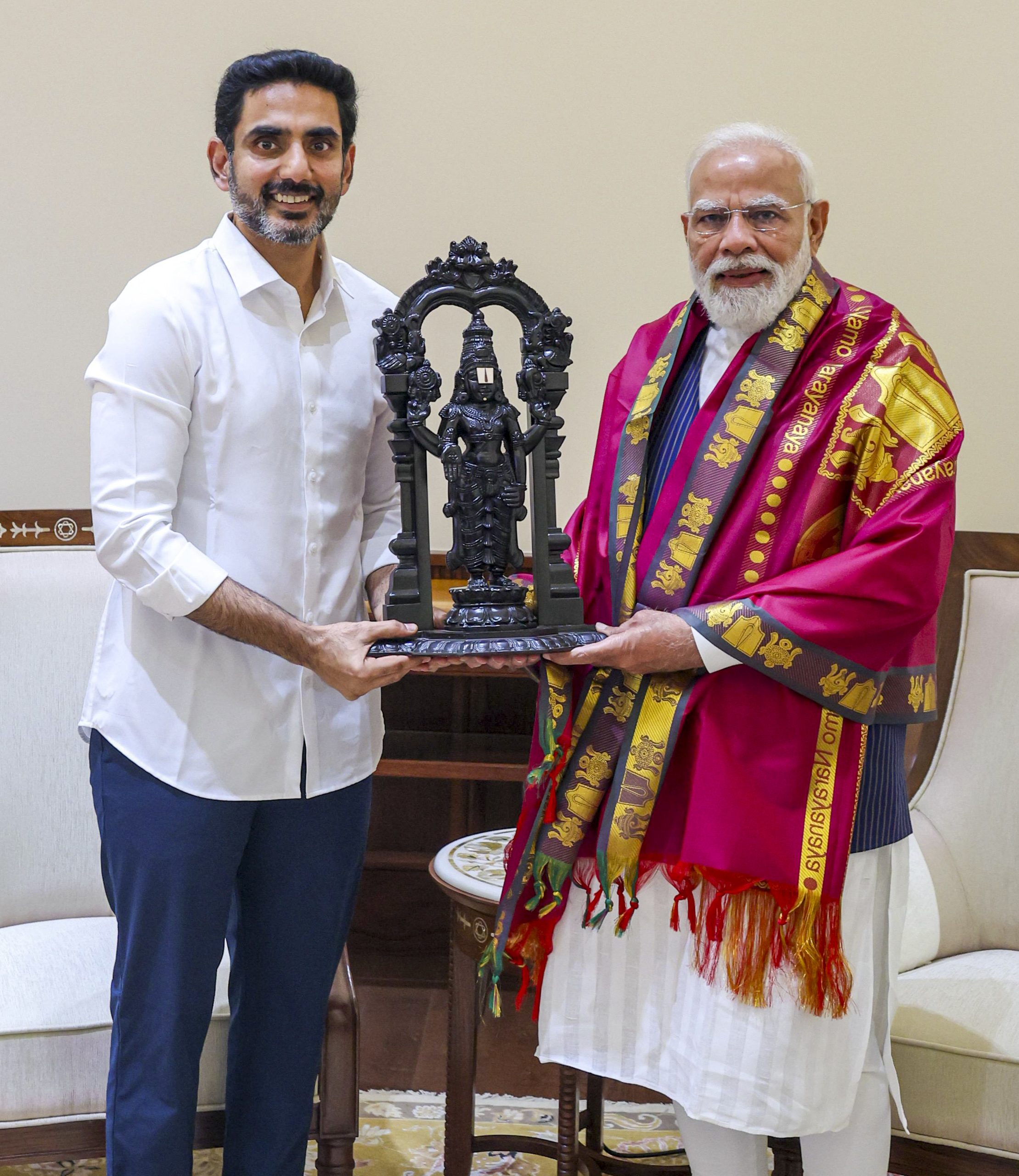 **EDS: THIRD PARTY IMAGE** In this image posted on April 2, 2026, Prime Minister Narendra Modi, right, being felicitated by Andhra Pradesh HRD Minister Nara Lokesh during a meeting. (@naralokesh/X via PTI Photo)(PTI04_02_2026_000073B)