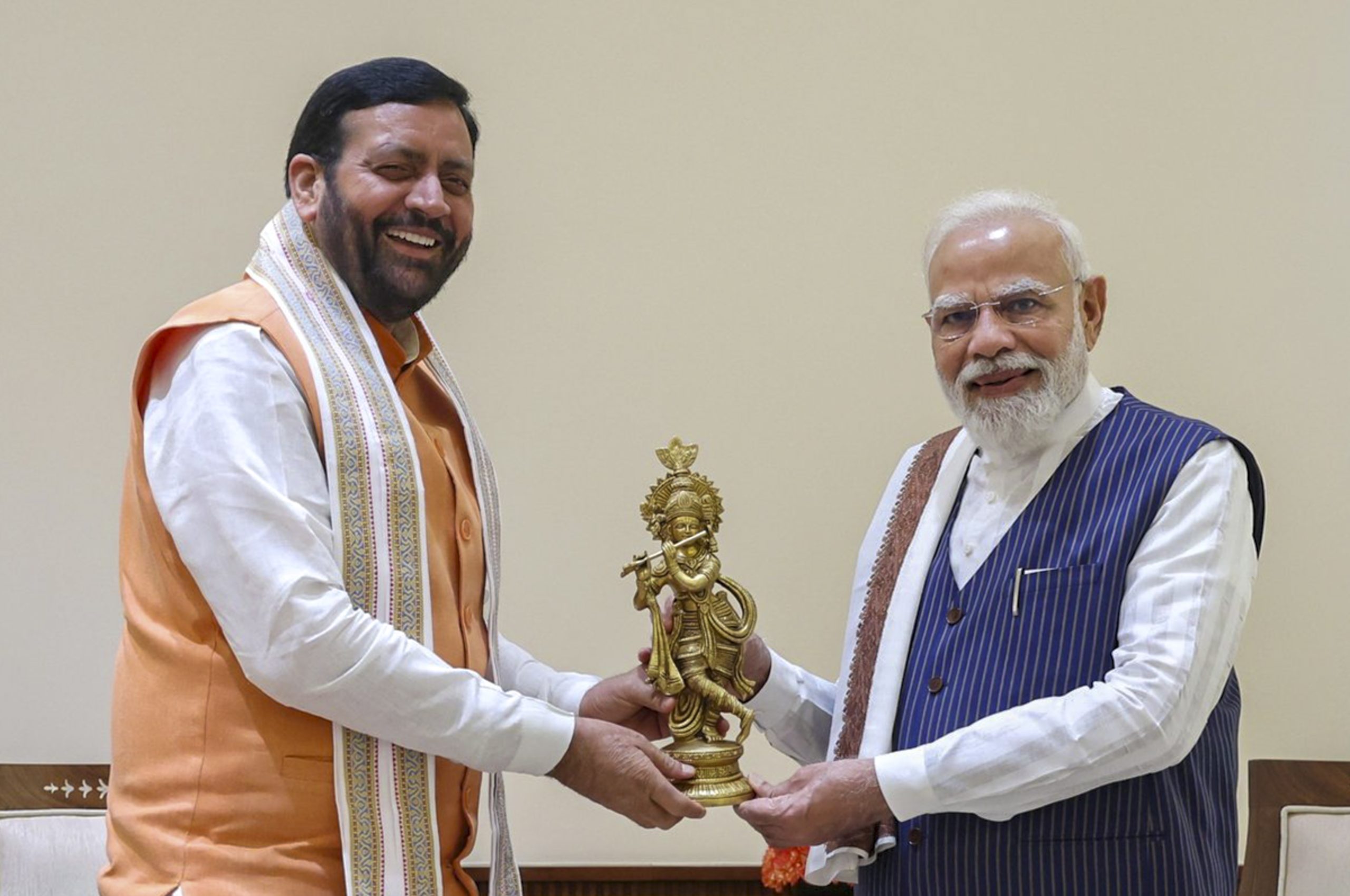 **EDS: THIRD PARTY IMAGE** In this image posted on April 2, 2026, Prime Minister Narendra Modi, right, being felicitated by Haryana Chief Minister Nayab Singh Saini during a meeting. (@PMOIndia/X via PTI Photo)(PTI04_02_2026_000058B)