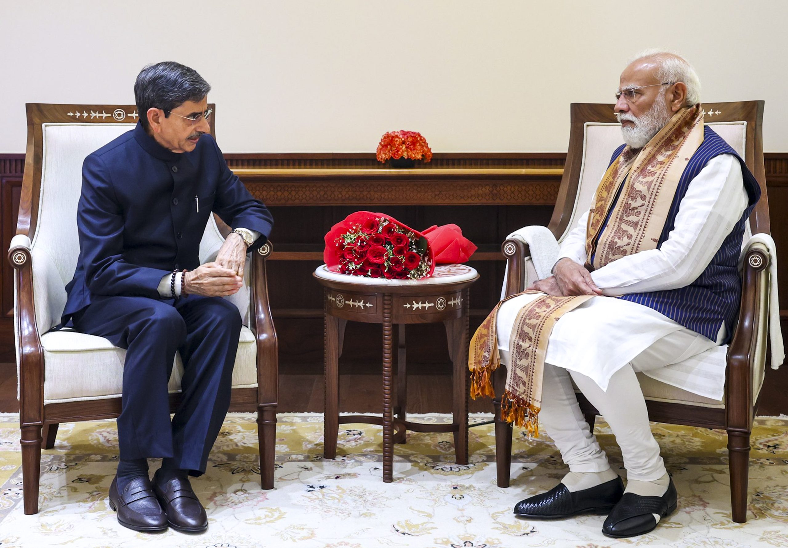 **EDS: THIRD PARTY IMAGE** In this image posted on April 2, 2026, Prime Minister Narendra Modi, right, interacts with West Bengal Governor RN Ravi during a meeting. (@PMOIndia/X via PTI Photo)(PTI04_02_2026_000059B)