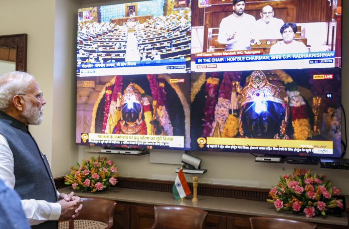 **EDS: THIRD PARTY IMAGE** In this image received on March 27, 2026, Prime Minister Narendra Modi virtually observes the Budget session of Parliament along with the ‘Surya Tilak’ ceremony at the ‘Shree Ramjanmbhumi Temple Ayodhya’. (Handout via PTI Photo)(PTI03_27_2026_000088B)