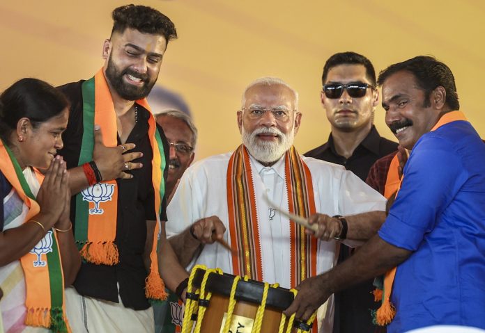 Palakkad (Kerala), Mar 29 (PTI) Prime Minister Narendra Modi on Sunday tried his hand at the ‘chenda’, a traditional percussion instrument, upon arriving at Kottamaidanam for a BJP election rally here.