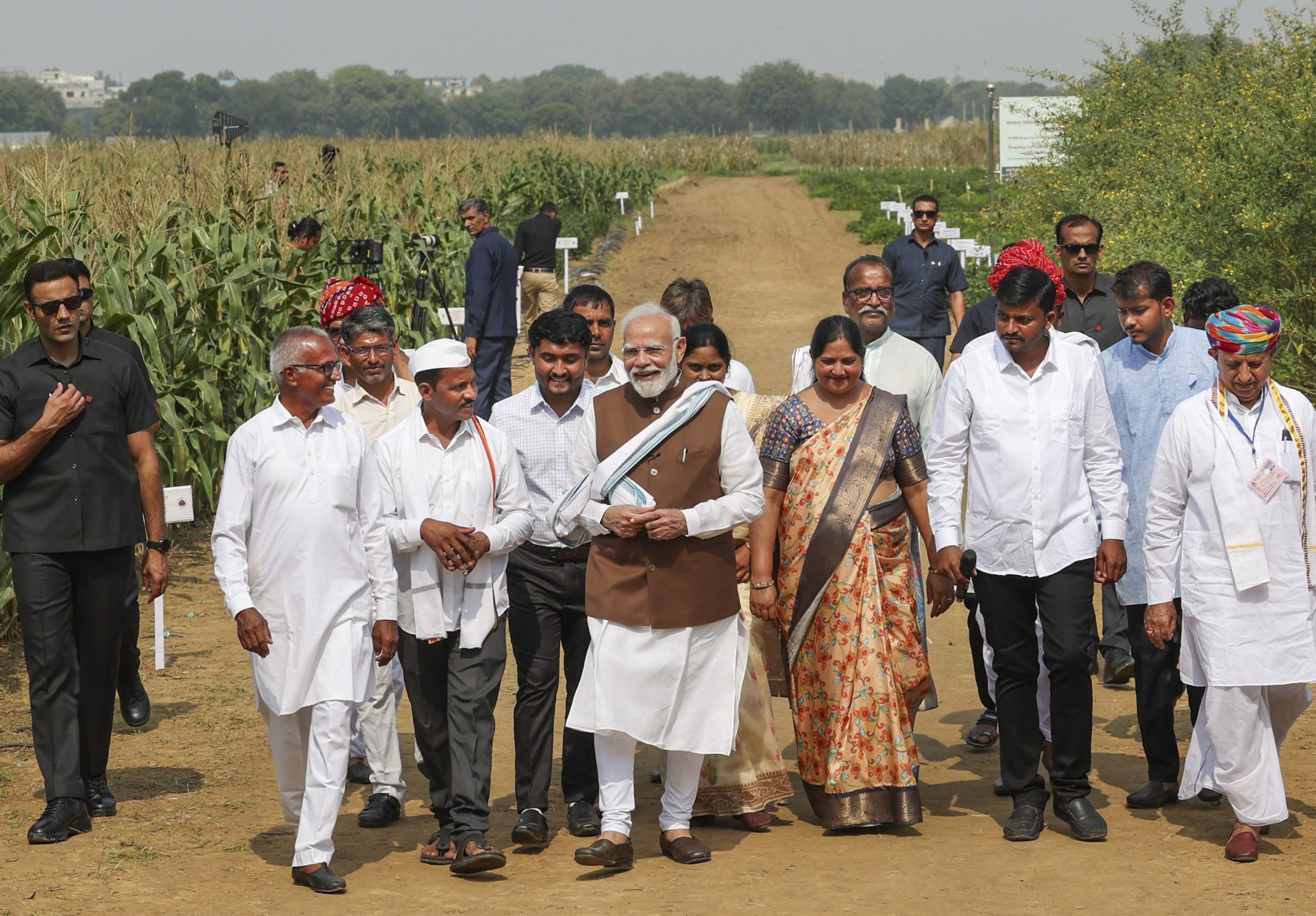 **EDS: THIRD PARTY IMAGE** In this image released on Oct. 11, 2025, Prime Minister Narendra Modi during an interaction with farmers at Indian Agricultural Research Institute, Pusa, in New Delhi. (PMO via PTI Photo) (PTI10_11_2025_000183B)