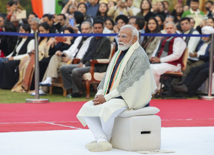 **EDS: THIRD PARTY IMAGE** In this image released on Jan. 30, 2026, Prime Minister Narendra Modi during a prayer meeting to pay homage to Mahatma Gandhi on his death anniversary, observed as Martyrs' Day, at Gandhi Smriti, in New Delhi. (PMO via PTI Photo) (PTI01_30_2026_000295B)
